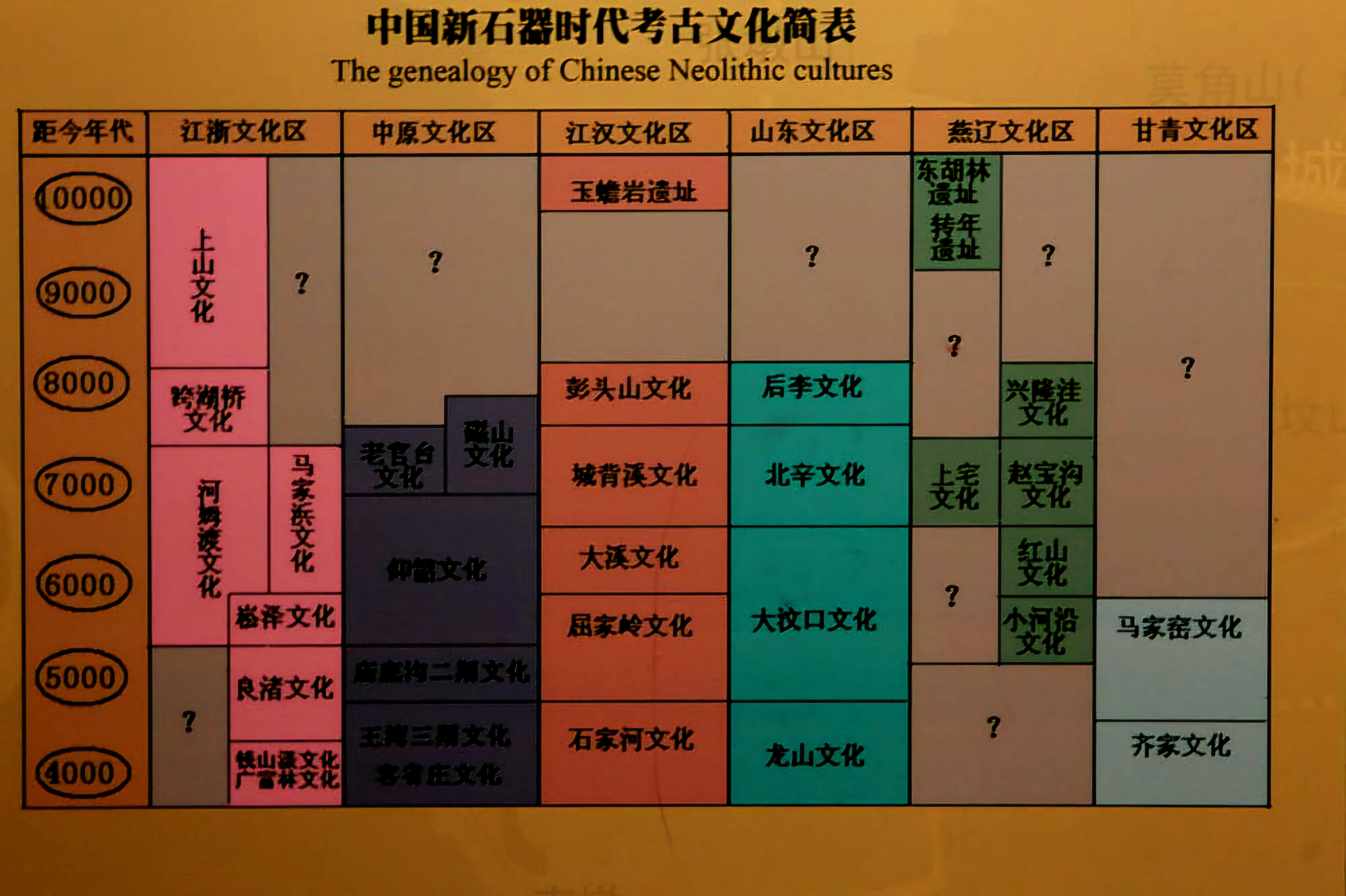 중국 신석기시대 문화 분포 현황을 중국신석시대고고문화간표中國新石器時代考古文化簡表[The Geneology of Chinese Neolithic Cultures]라 해서 일목요연히 도표로 정리한 것이다.