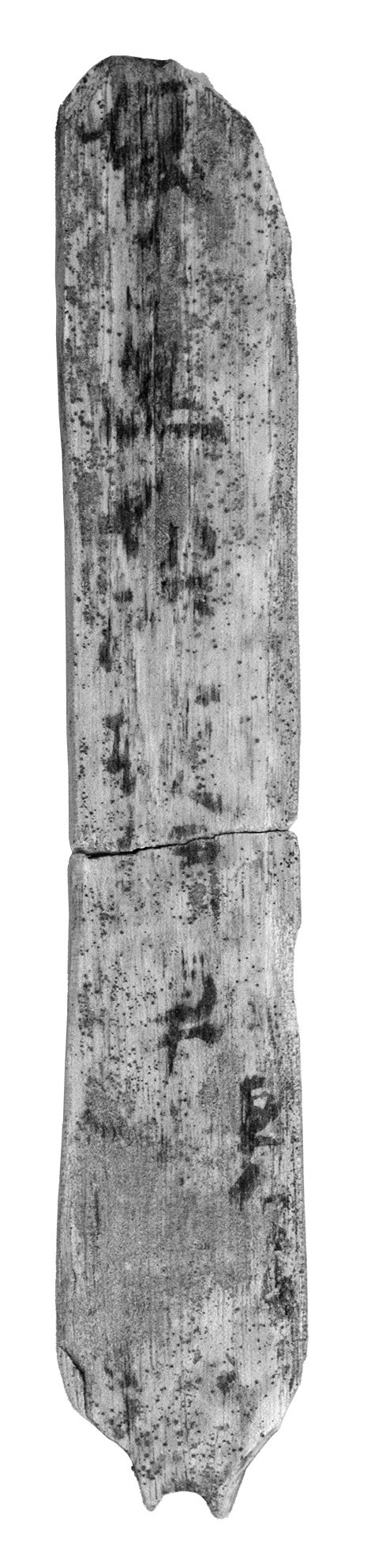 昨年4月に出土した木簡は長さ15.6センチ、幅2.5~2.7センチ、最大厚さ0.4センチである。 文字は片面から10~13文字確認された。 大字6~8字を一列に記し、右下に小字4~5字を記している。