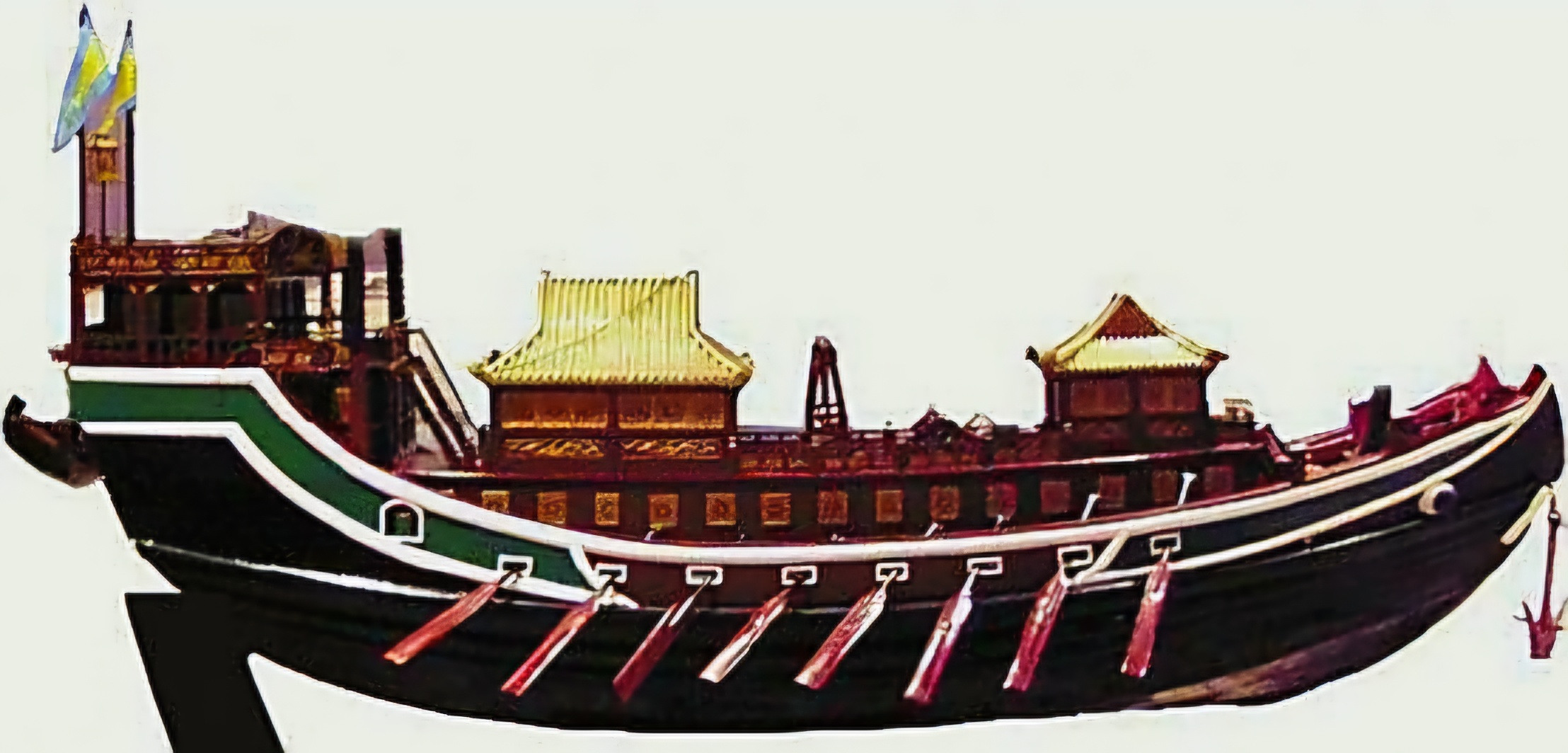 수룡골艏龍骨과 주룡골主龍骨 목재는 용뇌향 속龍腦香屬이며 미룡골艉龍骨은 석자石梓다. 선저船底 늑골재肋骨木材는 방향파루芳香坡壘, 오변자랄수五瓣子楝樹, 유목柚木, 패룡목佩龍木 등을 포함한다.
