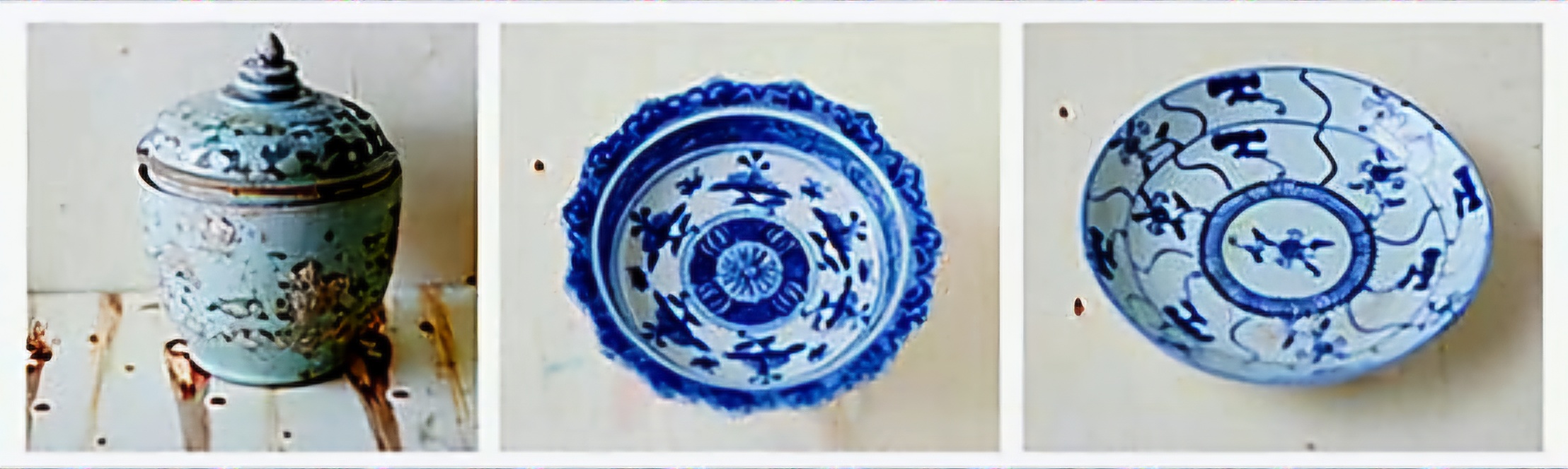 44건 오채자五彩瓷는 완碗 3건·관罐 7건과 개蓋 34건을 포함하며, 백태白胎에 녹綠·흑黑·홍紅·황색黃色을 띠지만 해수 침식으로 탈색이 심하다.