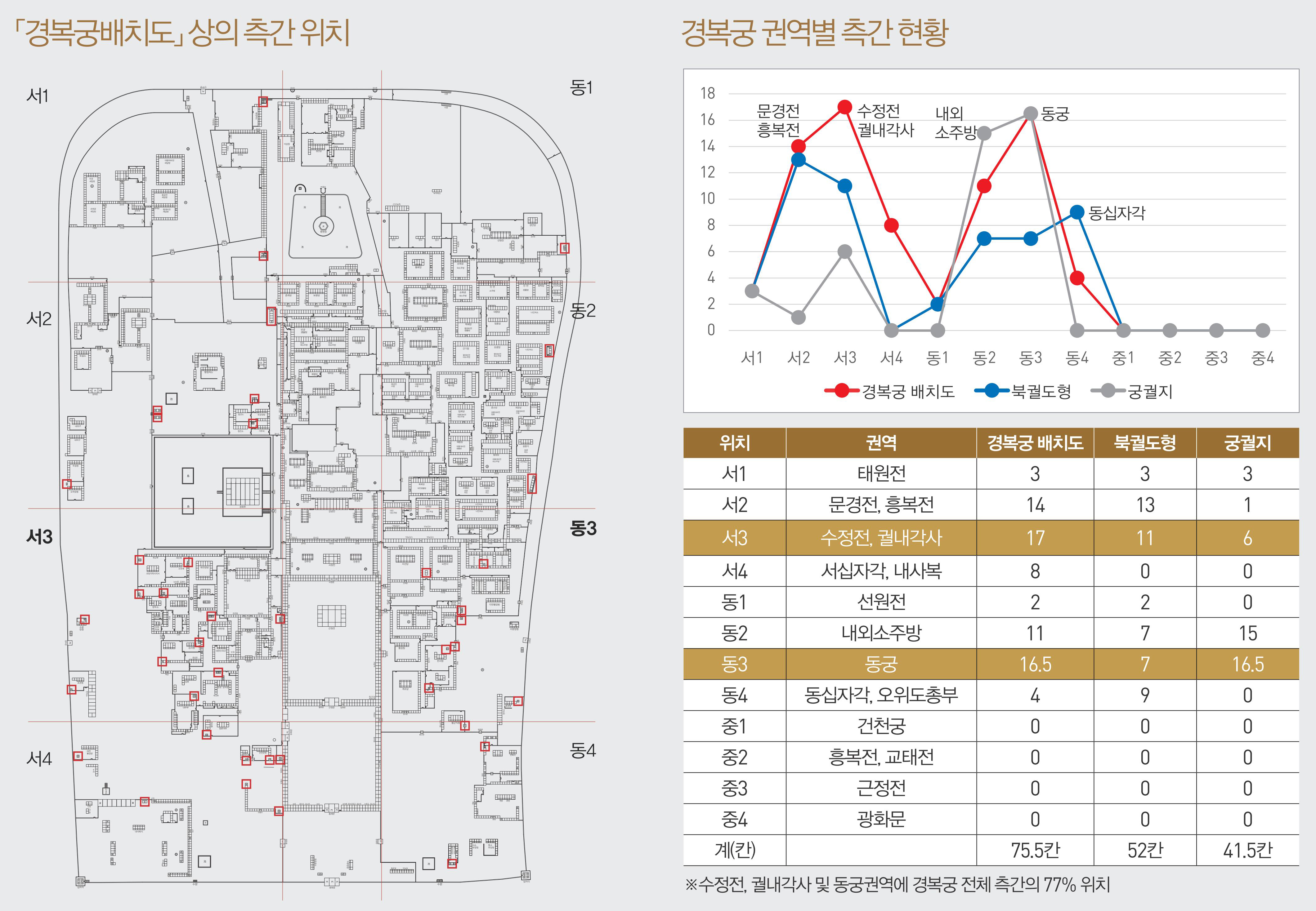 宮殿跡を見ると、「統長庁」の東には門旗手庁があるが、10間であり、トイレは4間である。 今(1904年頃)はない」という記録があるが、「門旗守直所」とも呼ばれた門旗手庁の東にトイレの遺跡が位置している。 同研究所によると、景福宮の配置図で門旗庁の東側の用途が分からない5間の建物も、トイレの遺跡と判断されているという。