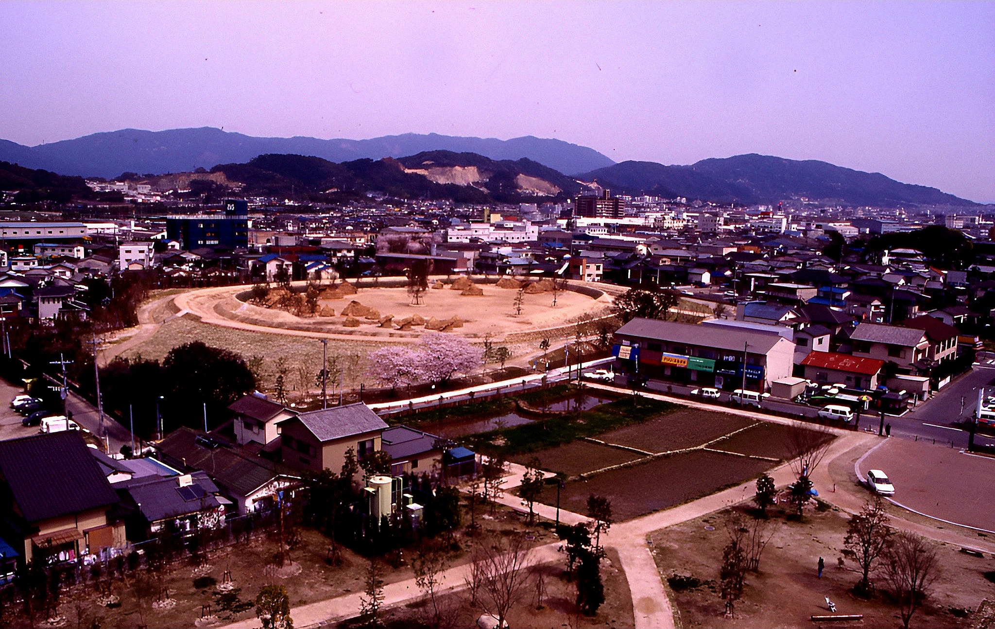 저대지 위 환호 취락과 주변 충적지에는 논이 펼쳐져 있고, 약간 떨어진 위치에는 무덤이 있다.