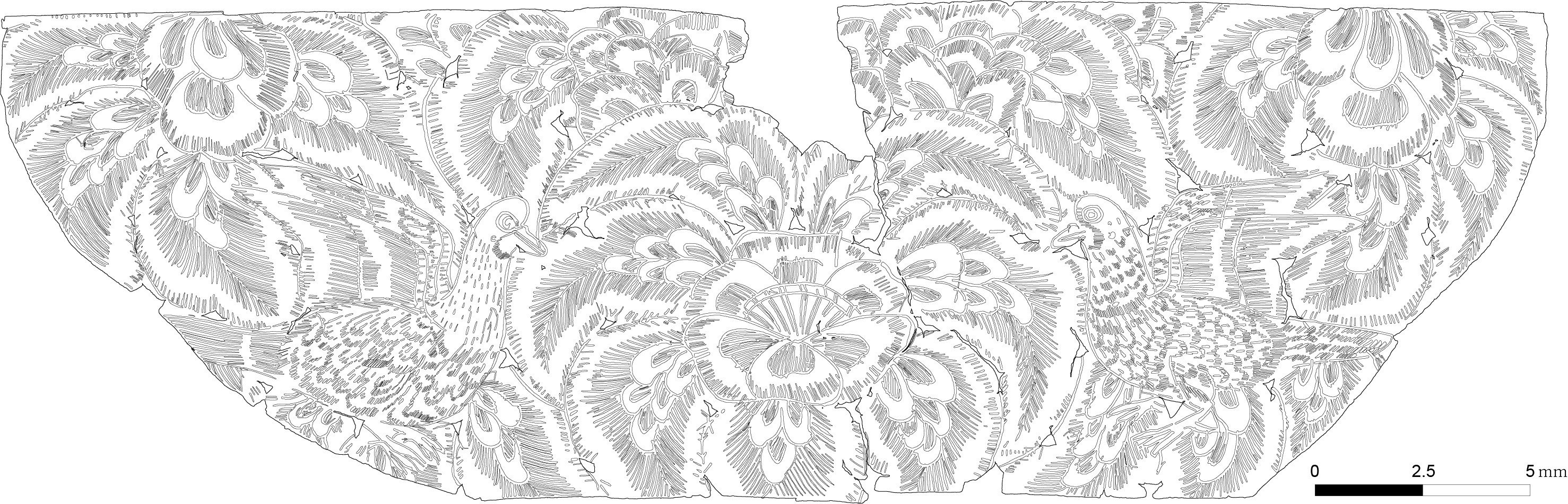 台形断面に左右対称に鳥2羽を配置し、中央部と鳥周辺には團華模様を鉄筆(先端部分が鉄筆されたペン)のような道具でぎっしりと刻んだ。團華は花を上から見たような模様を意味する。