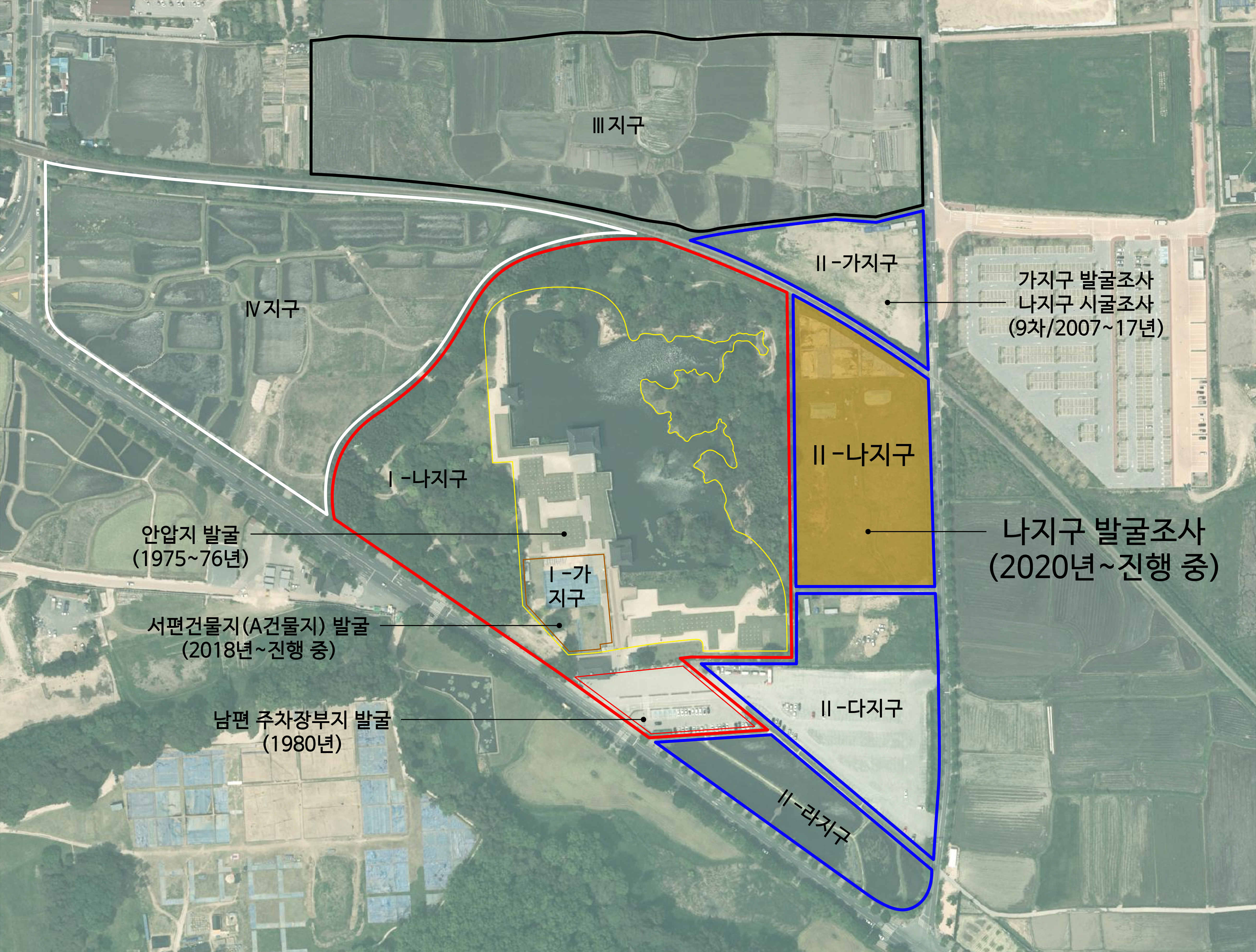 遺物出土地点は東宮と月池「ロ」地区の北側だ。 一点は建物跡と塀跡の間で姿を現し、もう一点は回廊建物跡で確認された。 両地点間の距離は約20mであり、遺物は発見当時、本来の形が分かりにくいほどしわくちゃになった状態だった。