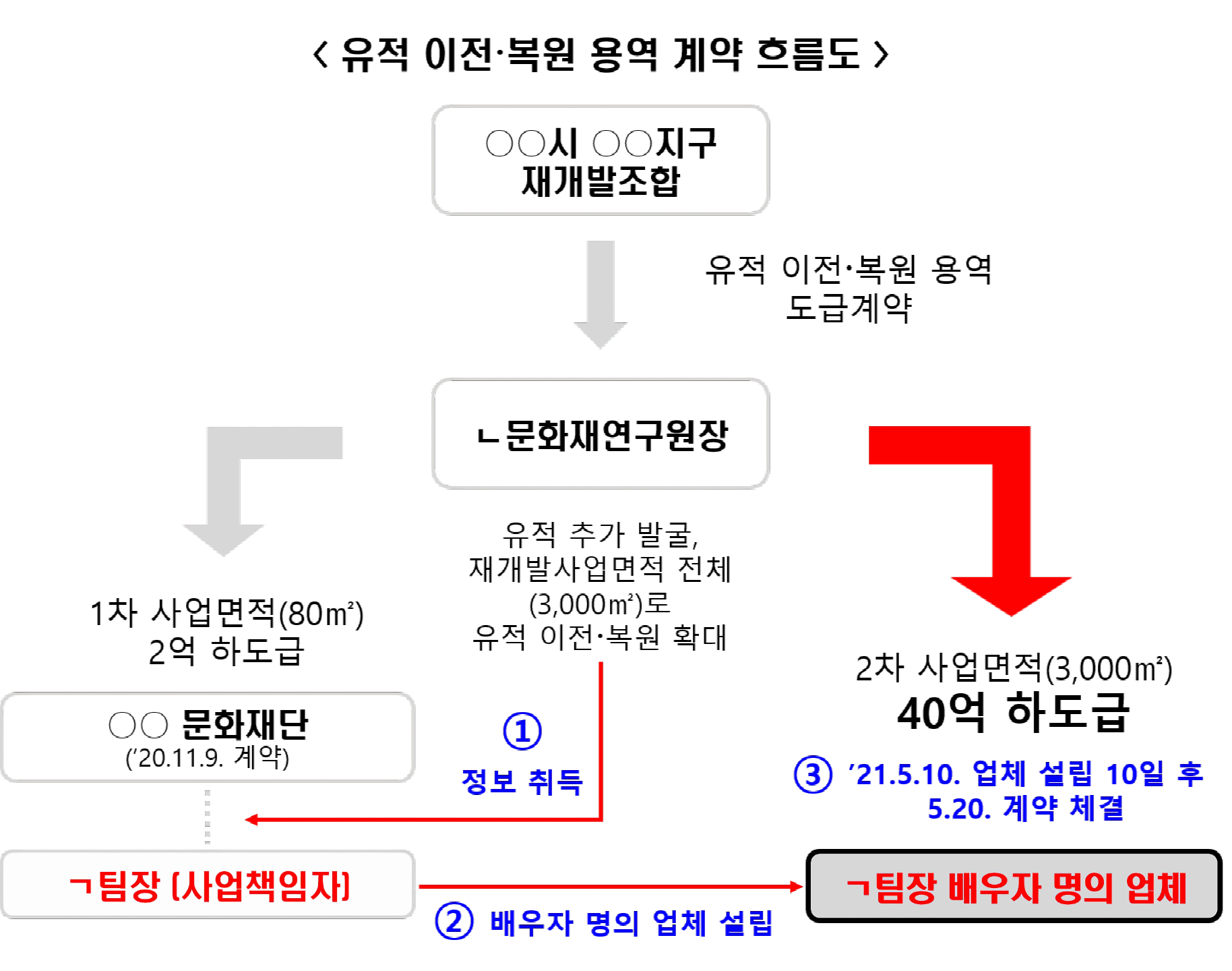 문제는 재개발구역에서 추가로 다량의 유적이 발굴되면서부터 시작됐다. ㄴ문화재연구원장은 재개발사업 시행자로부터 전체사업구역인 3,000㎡ 구역을 대상으로 하는 40억 원 가량의 용역을 추가로 수주받았고, 이를 알게 된 ㄱ팀장은 ㄴ문화재연구원장과 공모하여 이 40억 원의 용역을 자신의 아내 명의 업체에 일괄 하도급하게 하였다.