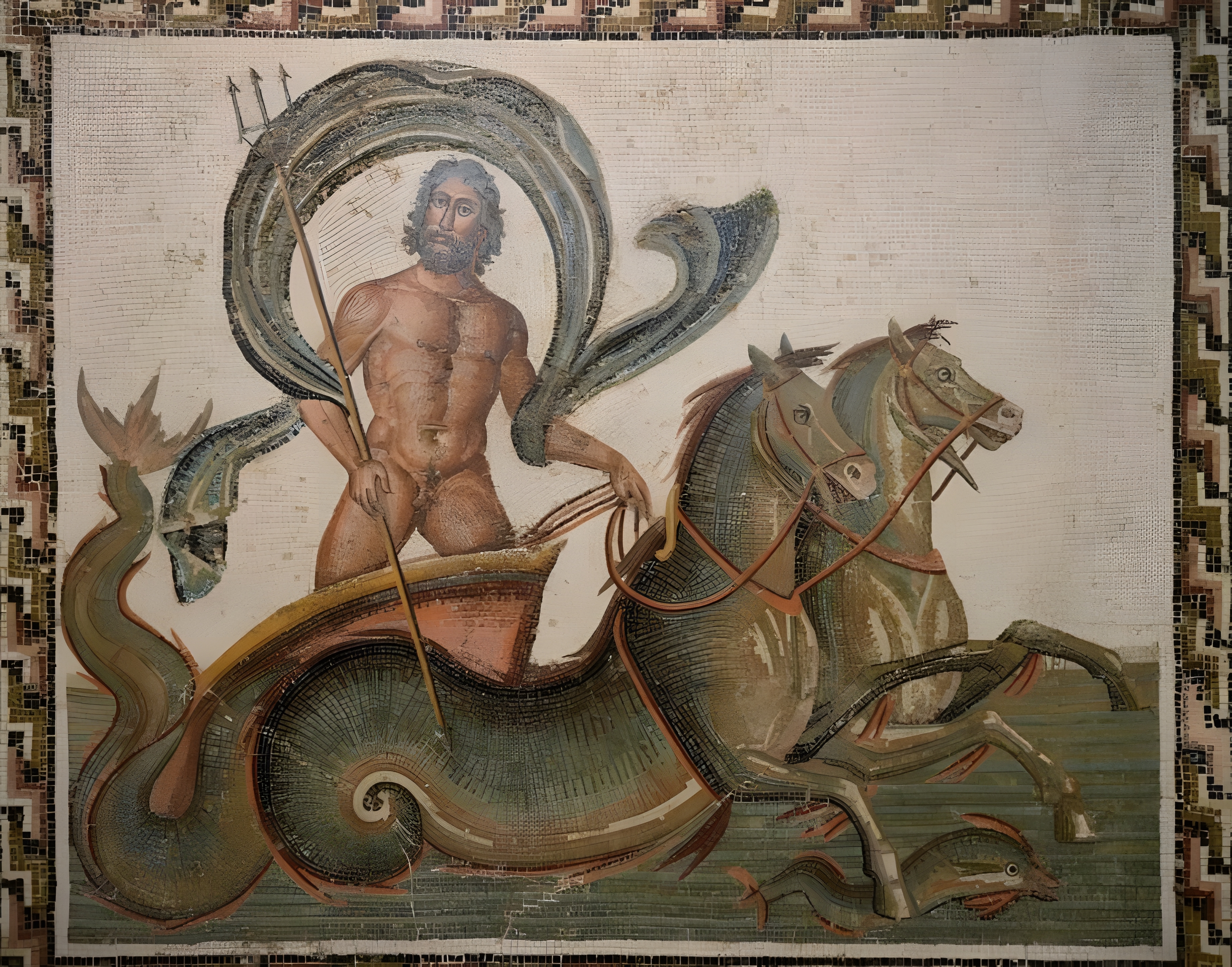 저 모자이크는 오늘날 튀니지 수스Sousse 지역 고대 로마 도시 하드루메툼Hadrumetum 출토품으로 대략 서기 3세기 제작으로 보며, 현재 수스 고고학 박물관 Sousse Archaeological Museum 소장품이다.