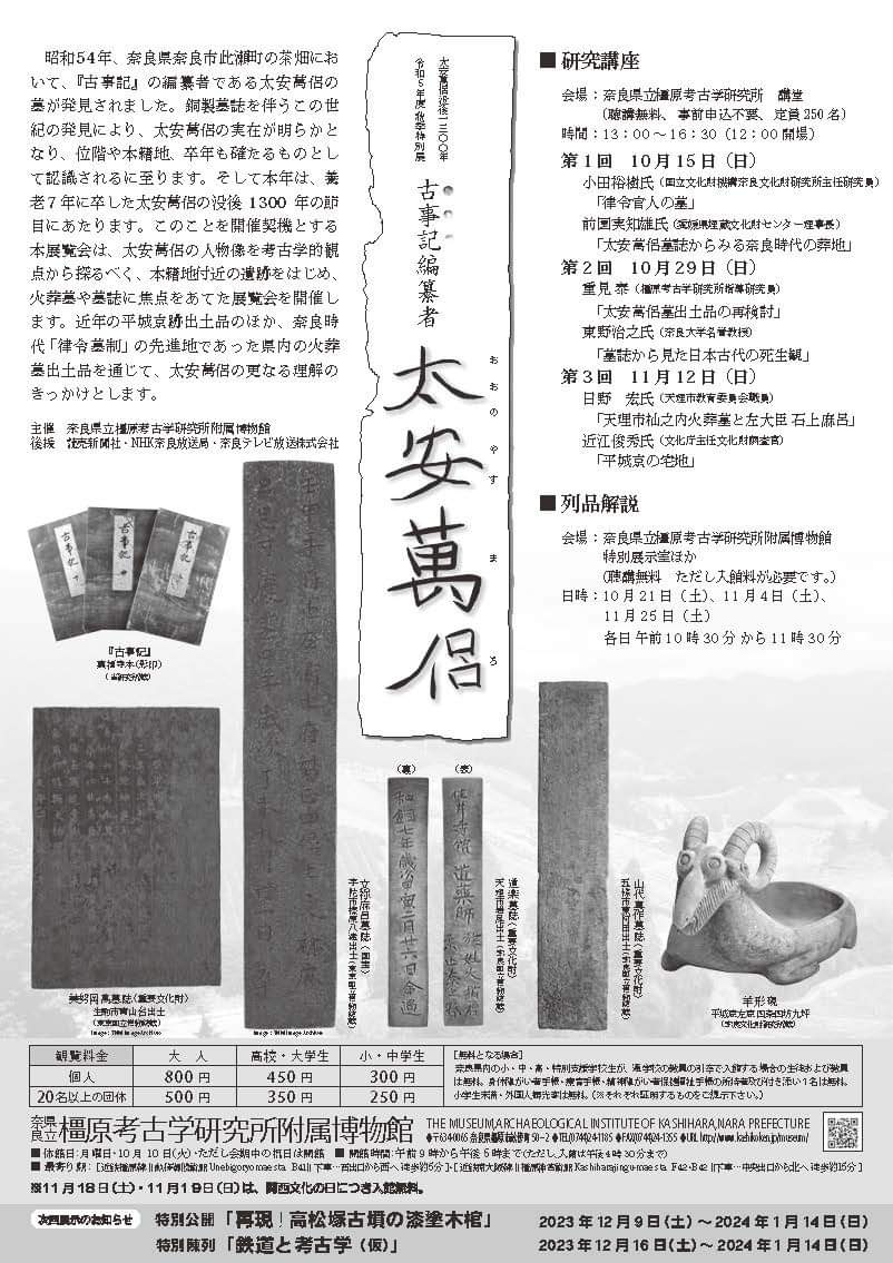 나라현립 가시하라고고연구소奈良県立橿原考古学研究所가 고사기古事記 저자 태안만려太安萬侶 몰후没後 1300년을 기념하는추계특별전'고사기 편찬자 태안만려古事記編纂者 太安萬侶'를 개최한다.