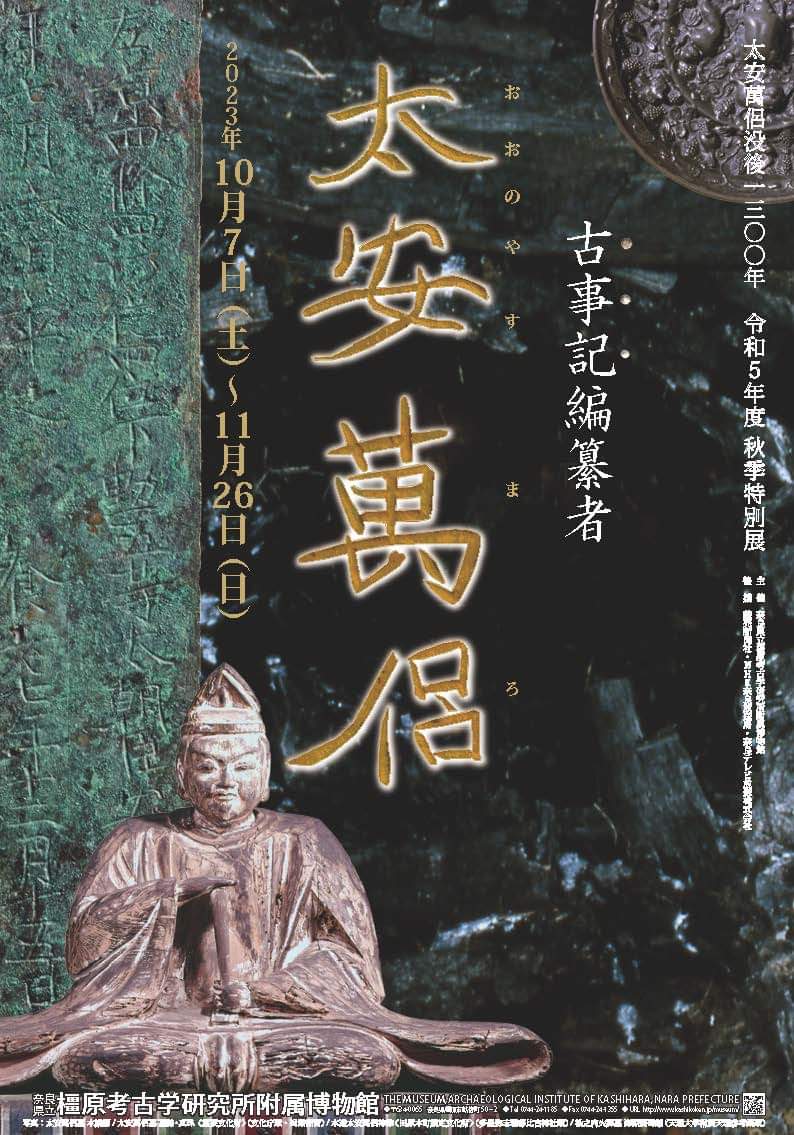나라현립 가시하라고고연구소奈良県立橿原考古学研究所가 고사기古事記 저자 태안만려太安萬侶 몰후没後 1300년을 기념하는추계특별전'고사기 편찬자 태안만려古事記編纂者 太安萬侶'를 개최한다.