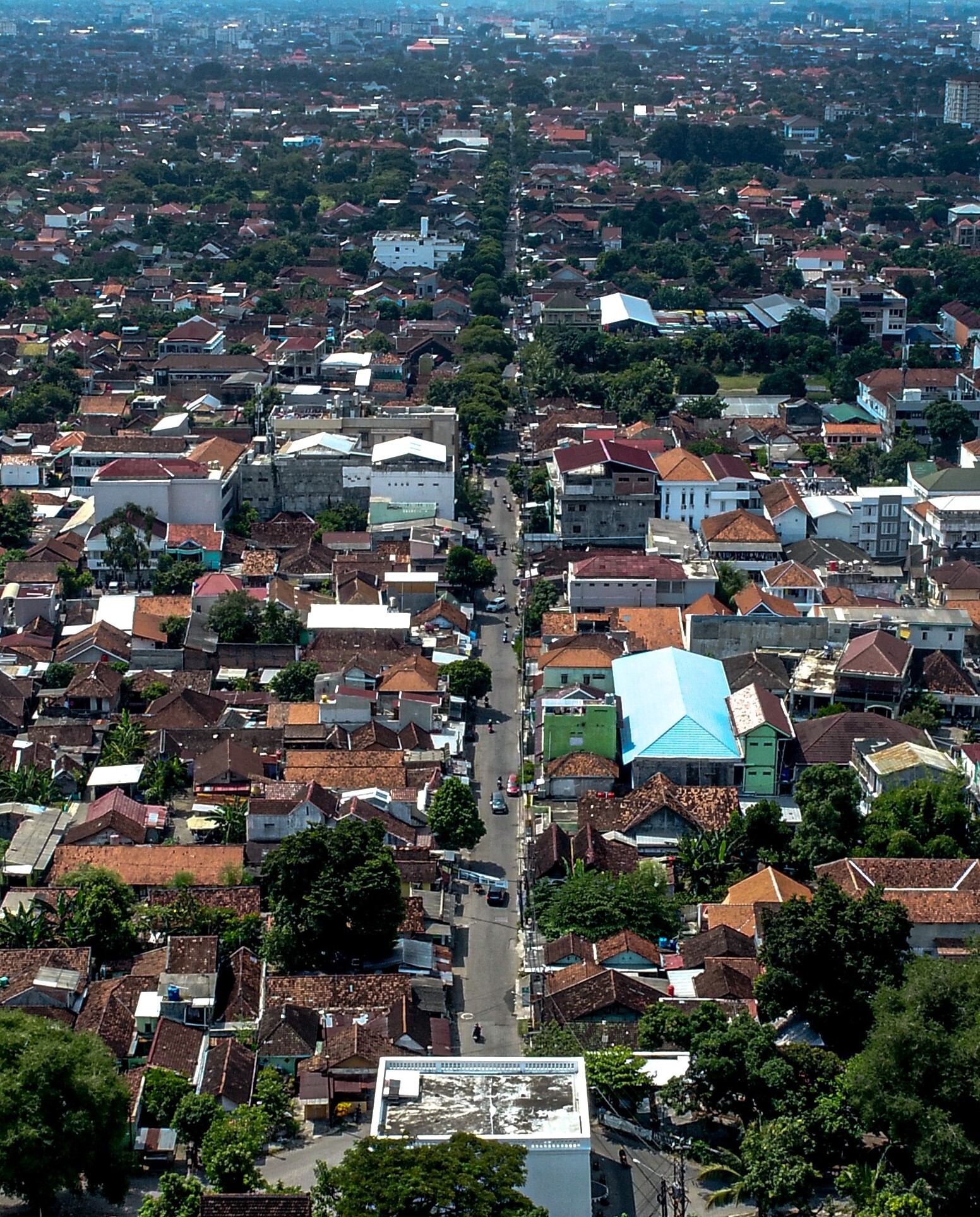 The six kilometre north-south axis is positioned to link Mount Merapi and the Indian Ocean, with the Kraton (palace) at its centre, and key cultural monuments lining the axis to the north and south that are connected through rituals.