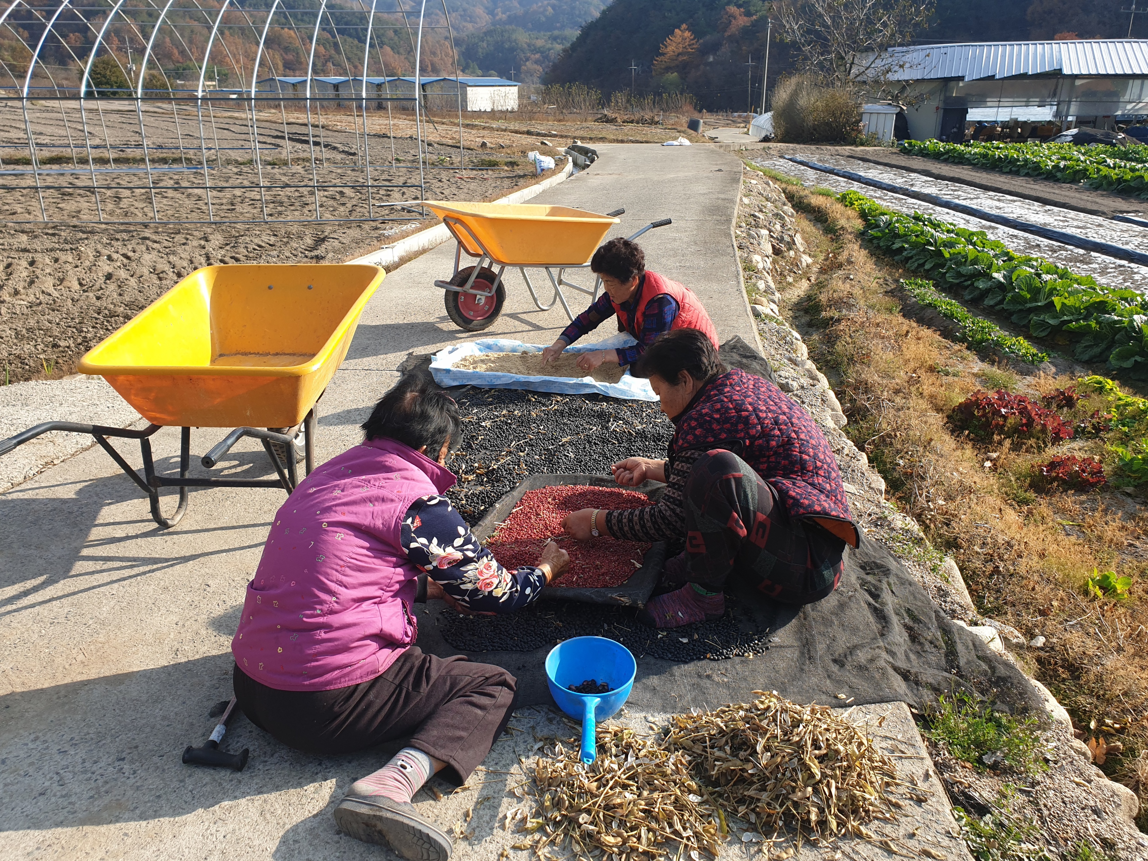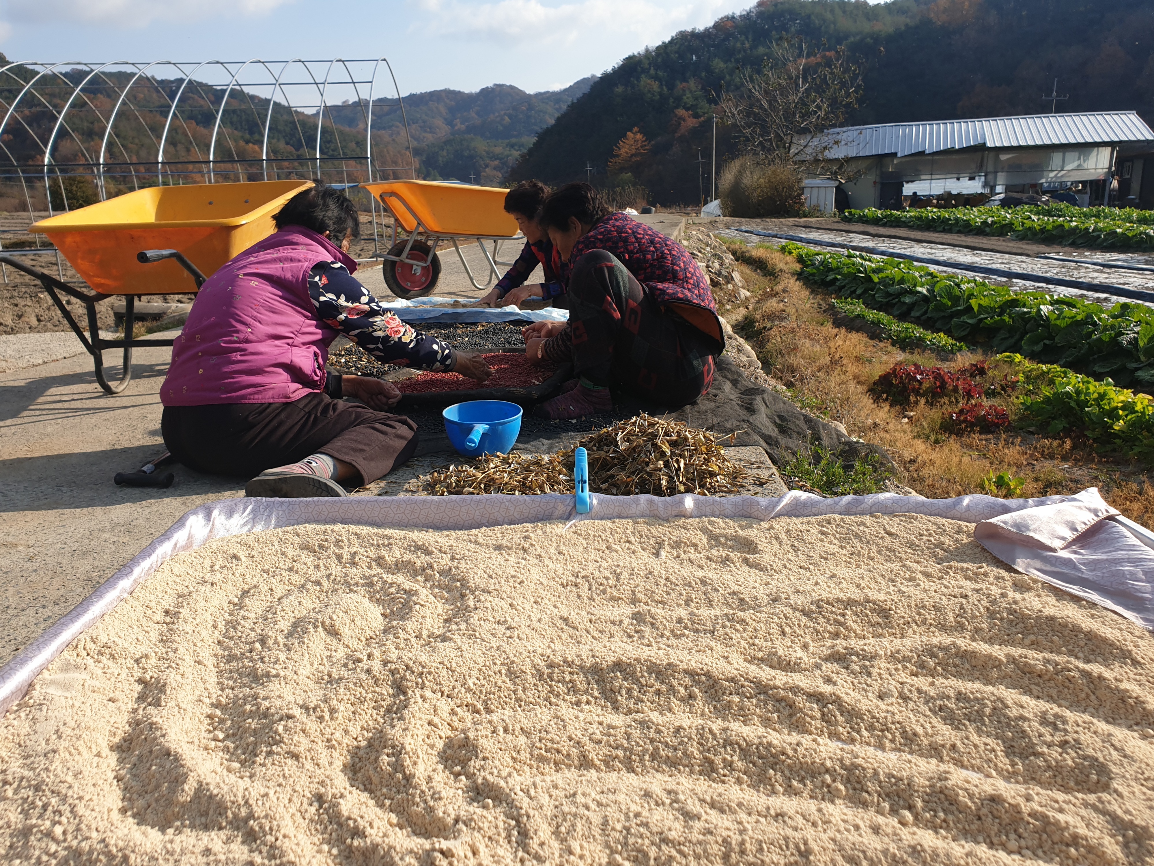 봄날처럼 포근한 날 아지매 셋이서 팥을 고르고 검은콩을 손질하며 무슨 가루를 갈무리한다.