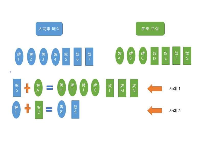 첨부한 그림은 하나의 예시이다. 대사헌 김태식에게는 비(婢)가 넷, 노(奴)가 셋으로 모두 7명의 노비가 있고, 참봉 기호철에게는 비가 셋, 노가 넷으로 모두 7명이다.
