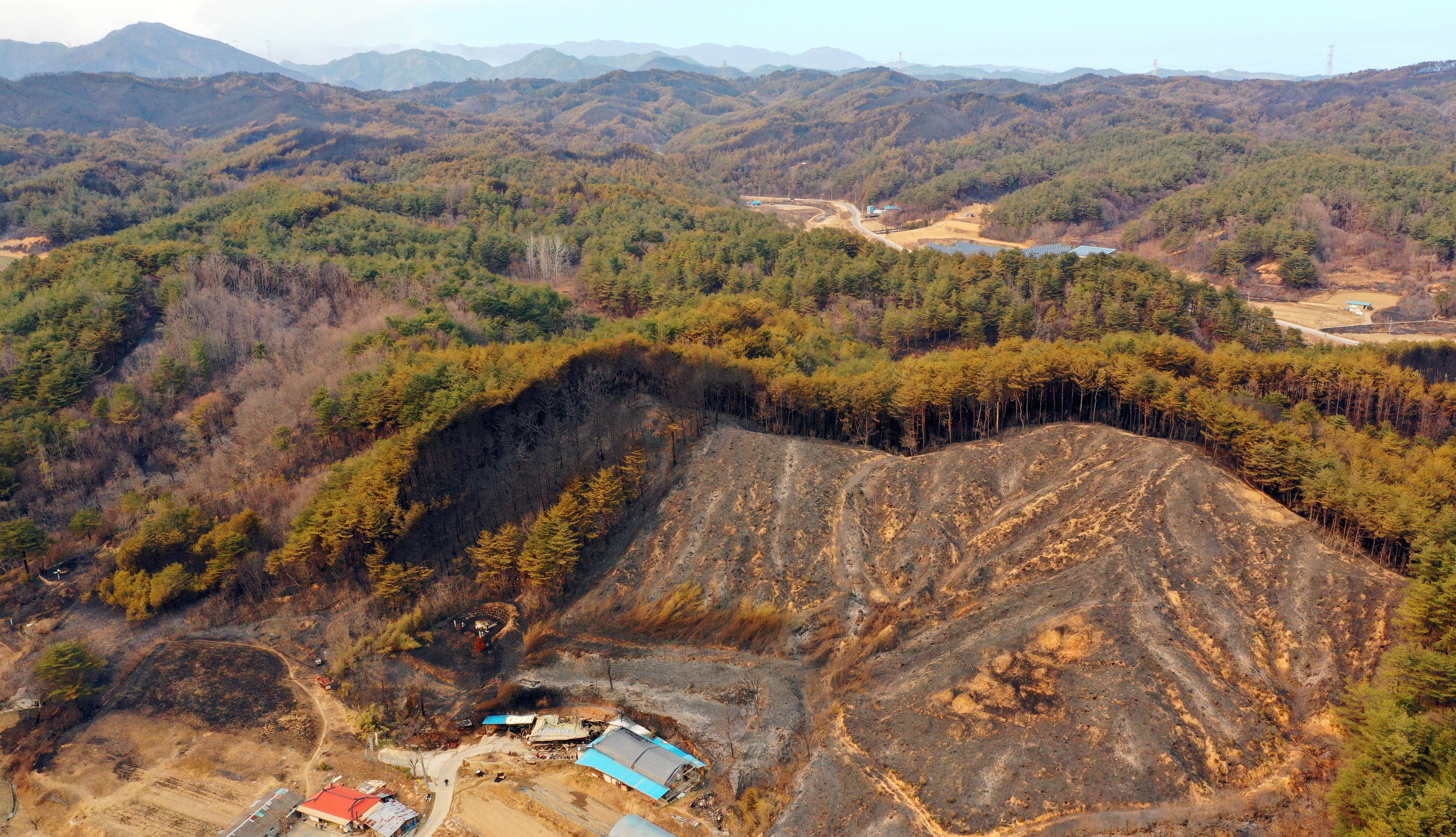 저 비봉산 정상을 중심으로 우리 집 우리 동네까지 직선거리로 대략 몇 킬로미터는 되는데, 우리 동네를 기준으로 저 높은(물론 우리 동네에서 해발 650미터는 야산이다) 산이 정상까지 홀라당 탔다.