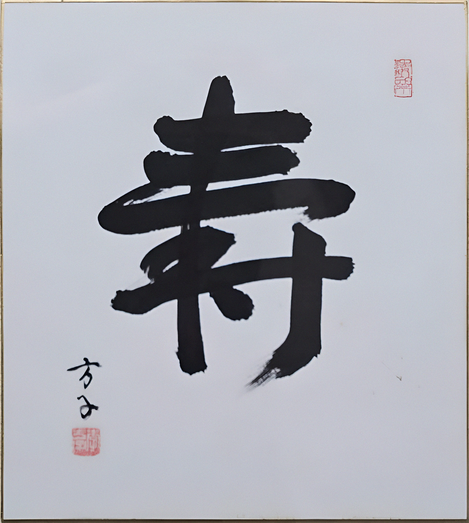 두방(스키시라고도 하는 종이판. 일종의 캔버스랄까?) 위에 굵은 획으로 슥슥, 초서 쓰듯이 그러나 빠르지 않고 진중하게 '목숨 수'를 썼다. (일본인이 썼으니 당연하겠지만) 일본 글씨 느낌이 난다.