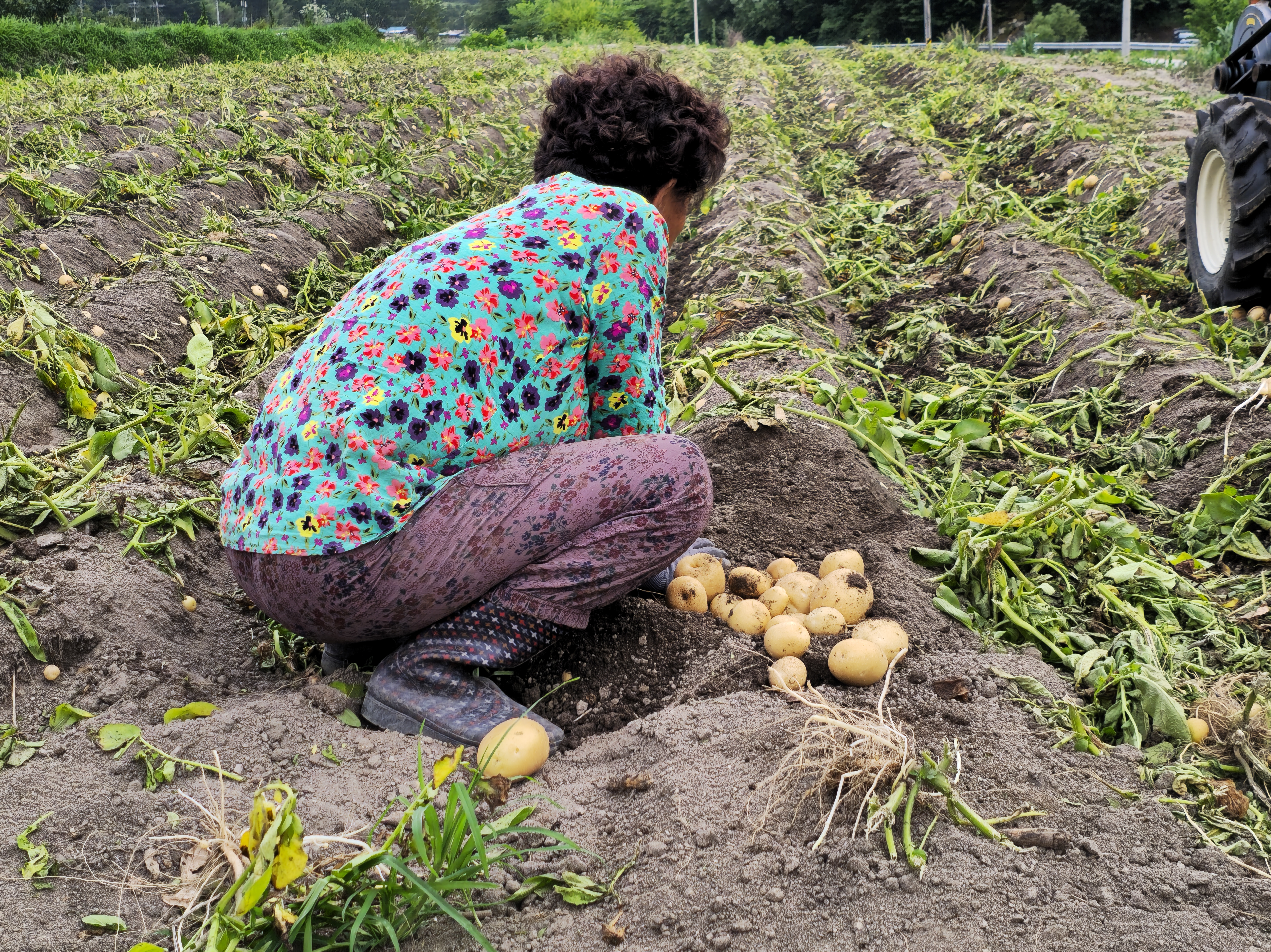 그런 시절에 견주면 요샌 제법 기계화해서 줄기 뽑아낸 이랑을 경운기를 개조한 기계가 좍 바닥을 훑어버리면 순식간에 이랑은 없어지고 허멀건 감자들만 토실토실 나뒹구니