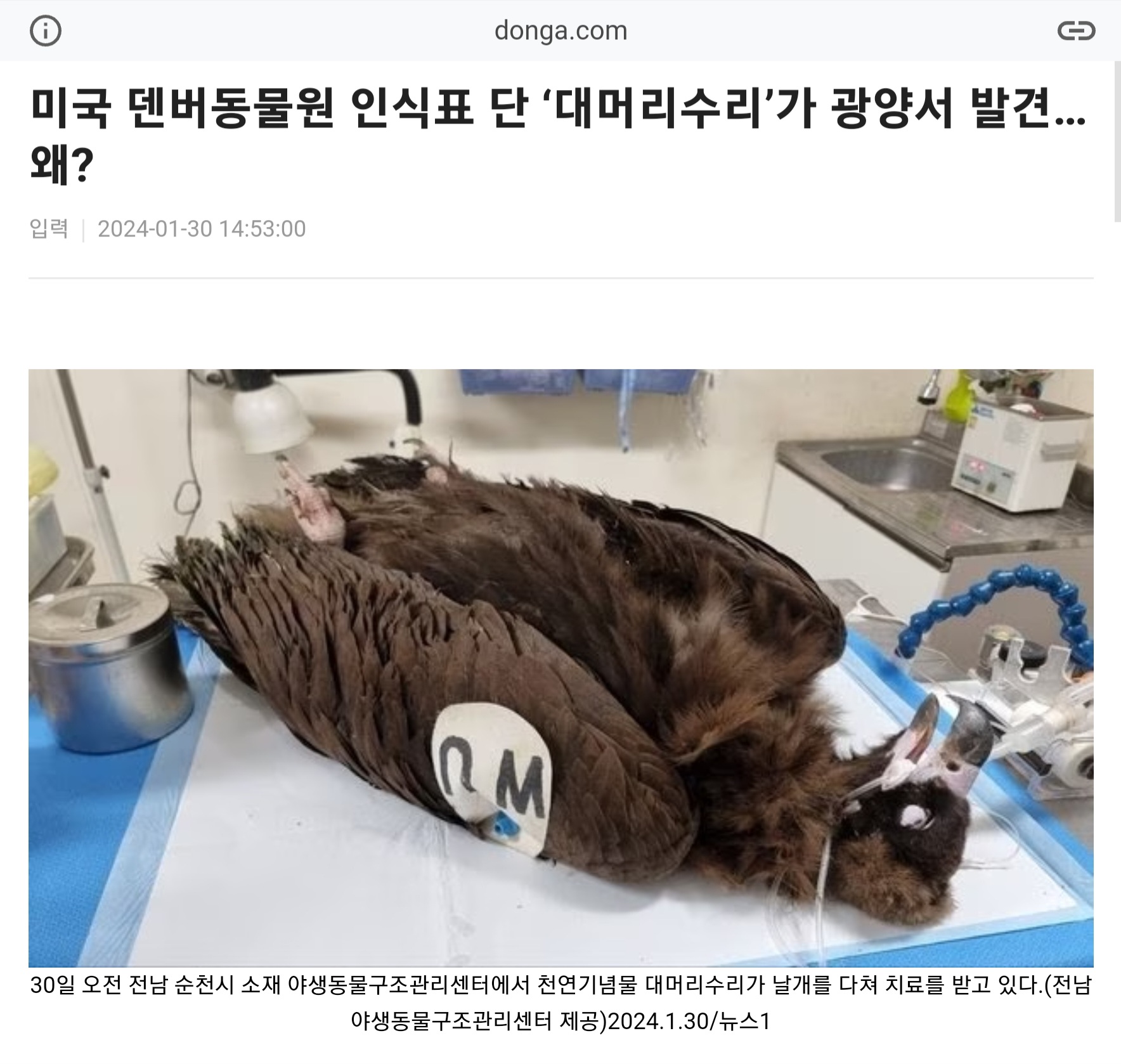 미국 동물원 인식표가 부착된 천연기념물 대머리수리가 전남 광양에서 다친 채 발견돼 동물센터에 의해 구조됐다. 30일 전남야생동물구조관리센터에 따르면 전날 오후 12시17분쯤 광…