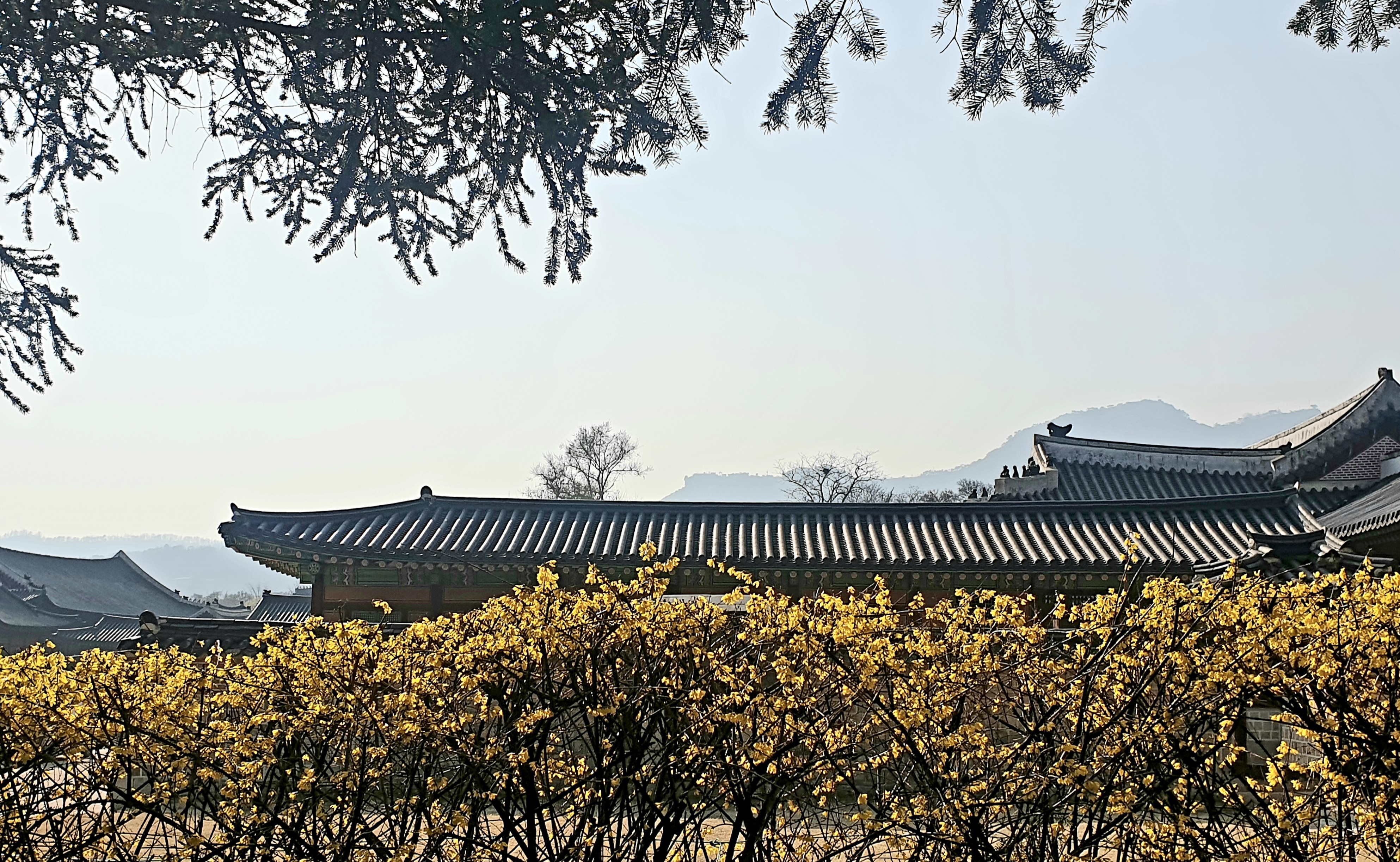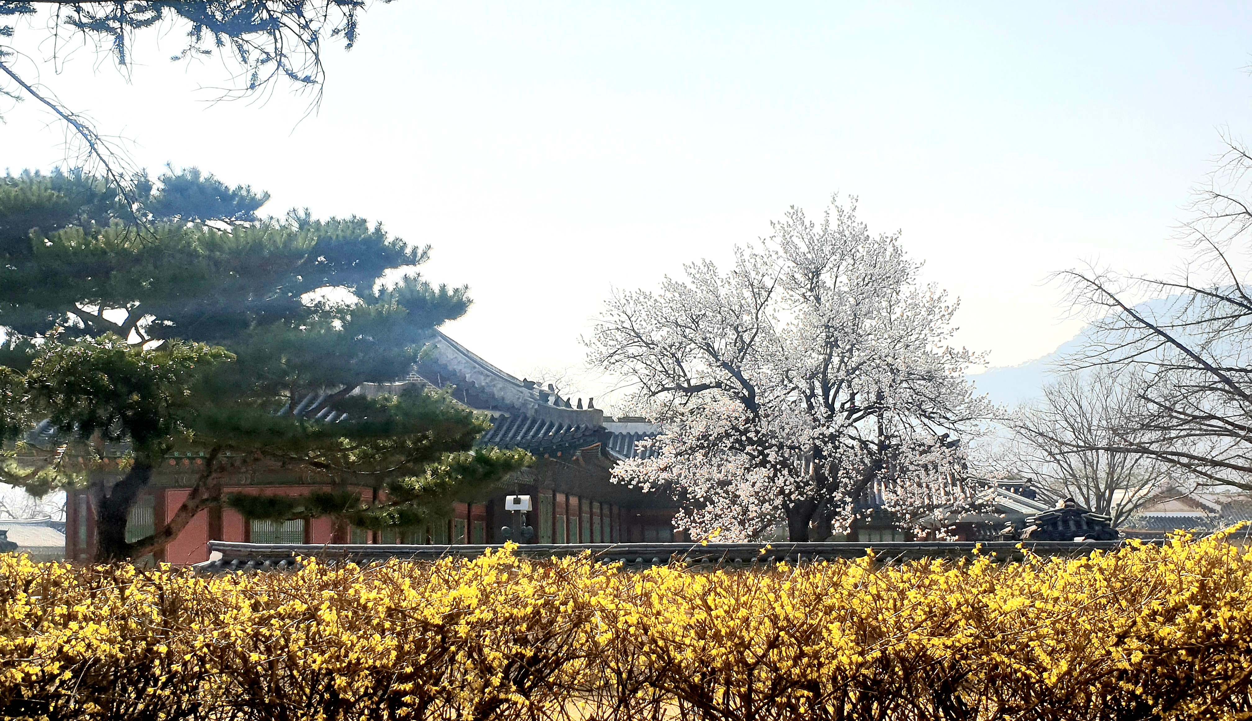 개나리 만발한 담장 너머로 경복궁이, 다시 그 너머로 나도 있다 하며 인왕 마운틴이 고개만 들이민다.