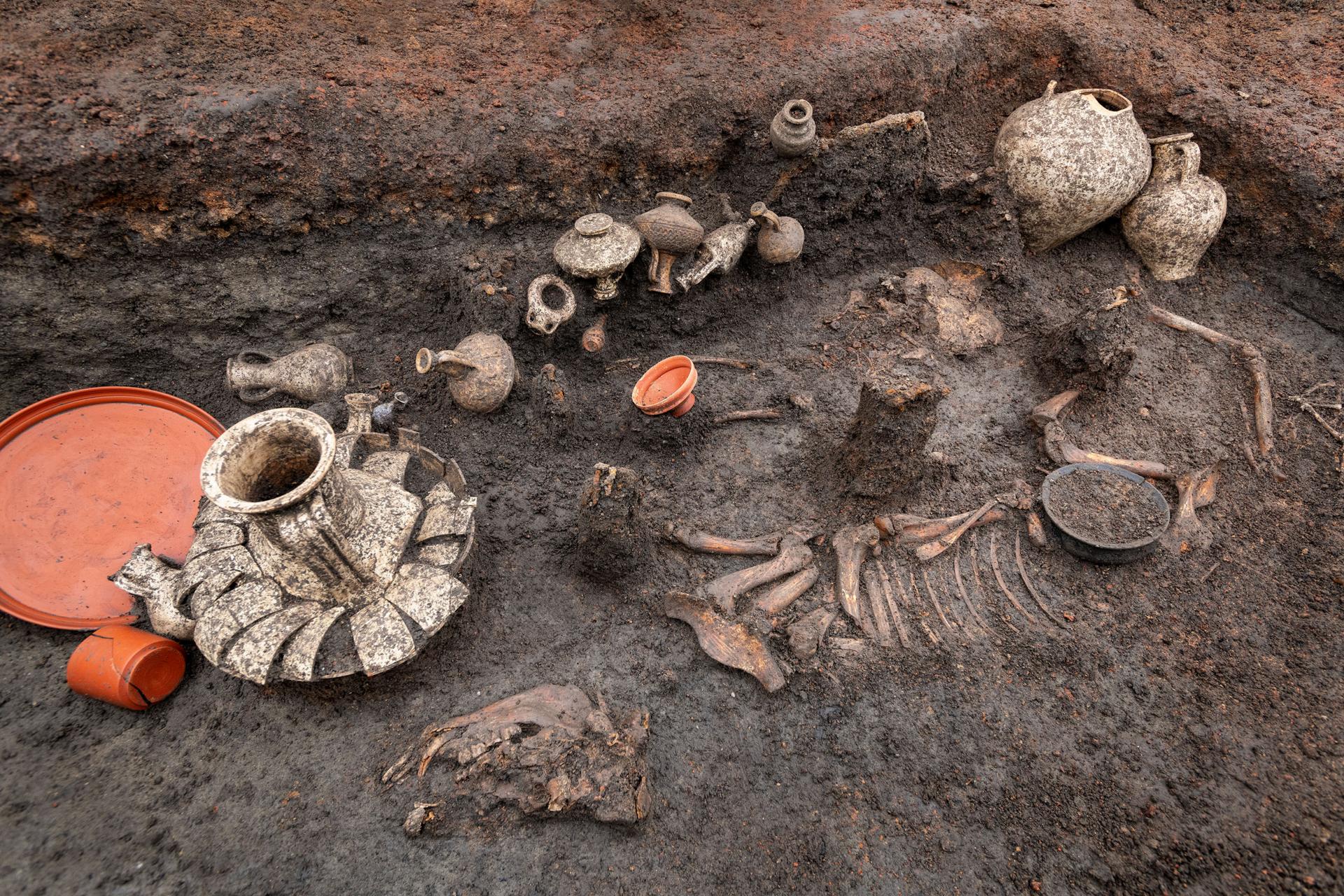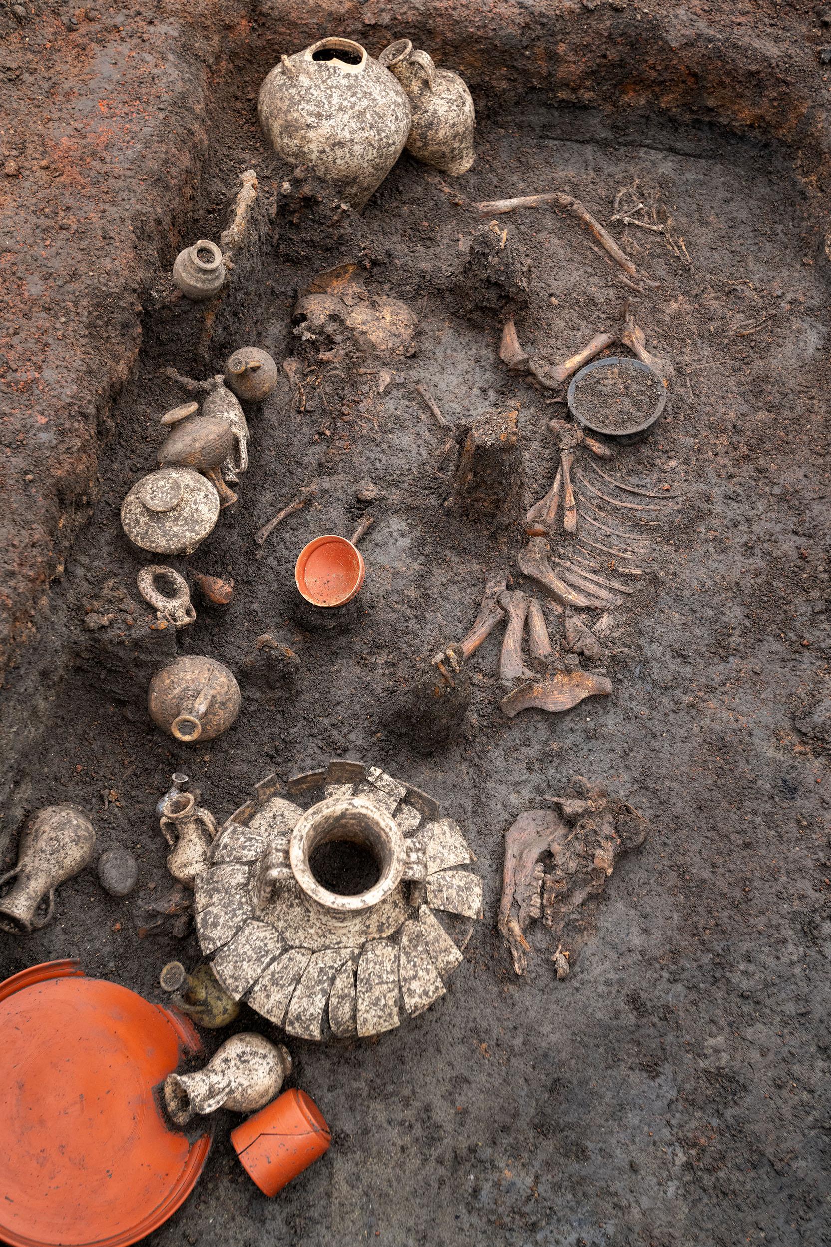 목관과 그 뚜껑 주변으로는 20점가량 되는 테라코타 용기를 두었다. 장례식에 동반하는 음식이나 음료를 넣었다. 도축(아마 희생이라는 뜻인듯) 관련 유물도 많다. 길이 방향으로 절반을 잘라낸 돼지가 있는데...영어번역으로는 충분한 이해가 불가능...암튼 돼지를 잘라 넣었다는 뜻이다. 미니어처 꽃병과 두 개 유리병에는 아마도 화장품이나 의약품을 넣었을 것이다. 그에 대한 성분분석이 가능할 전망이다.