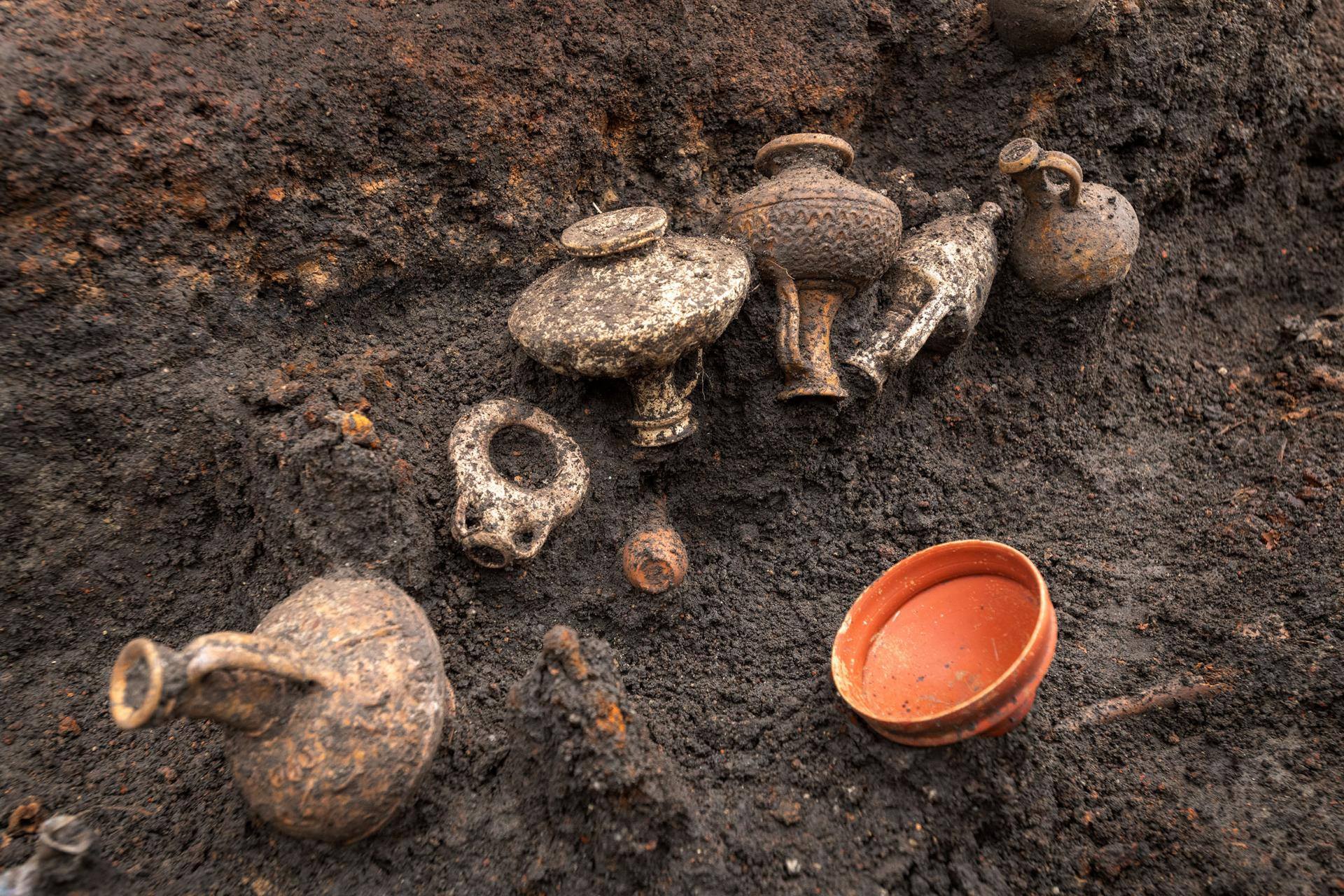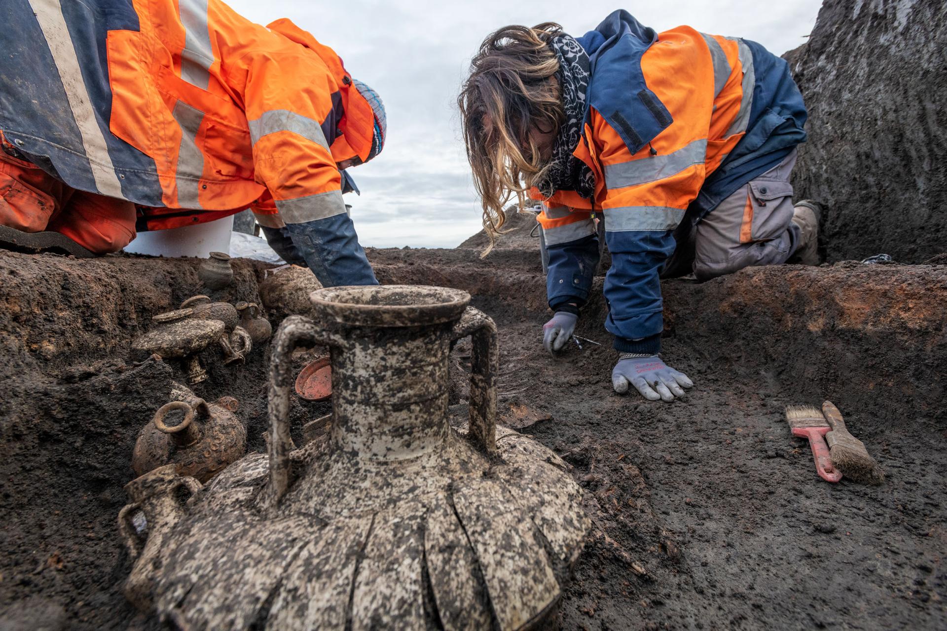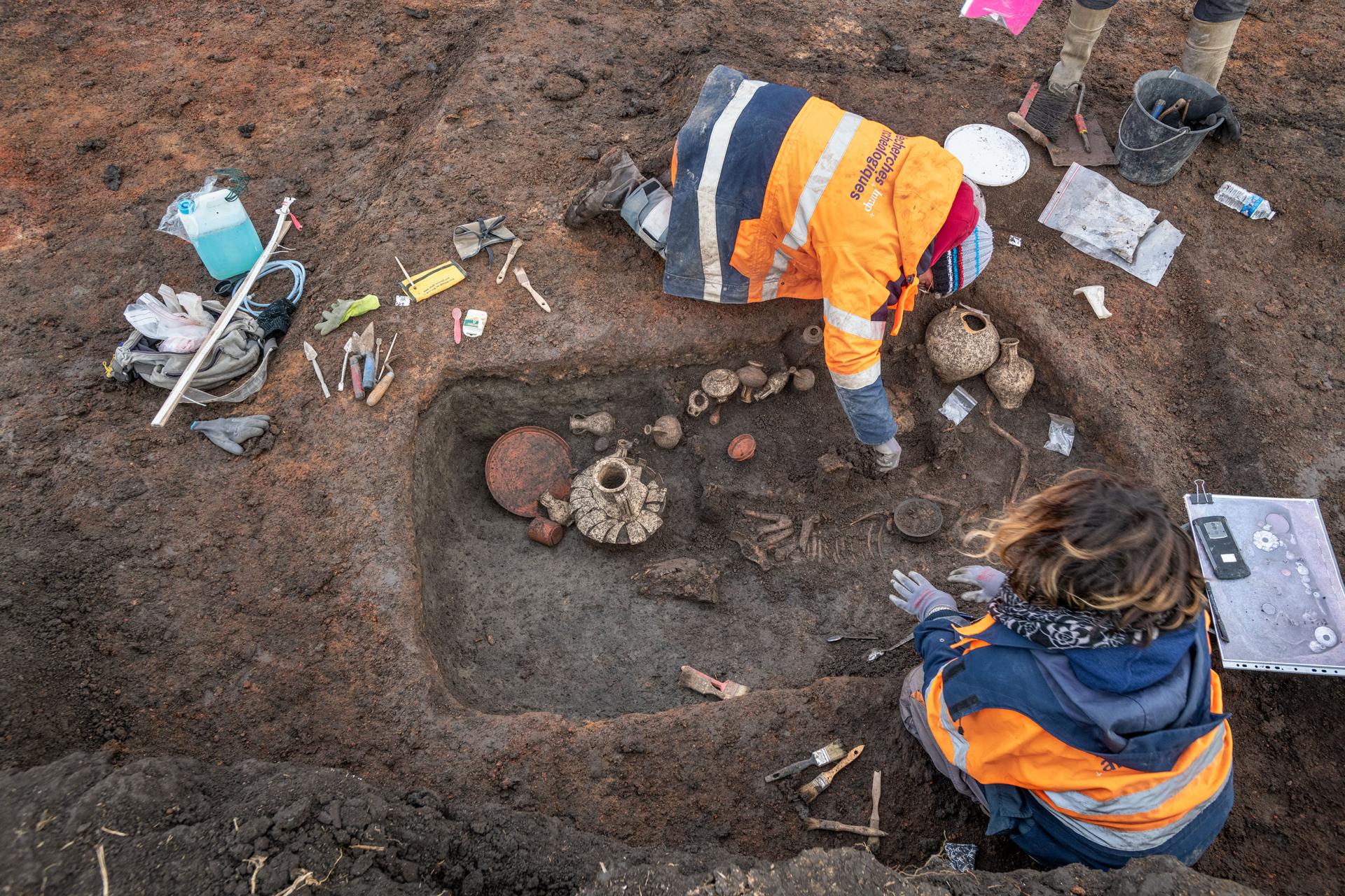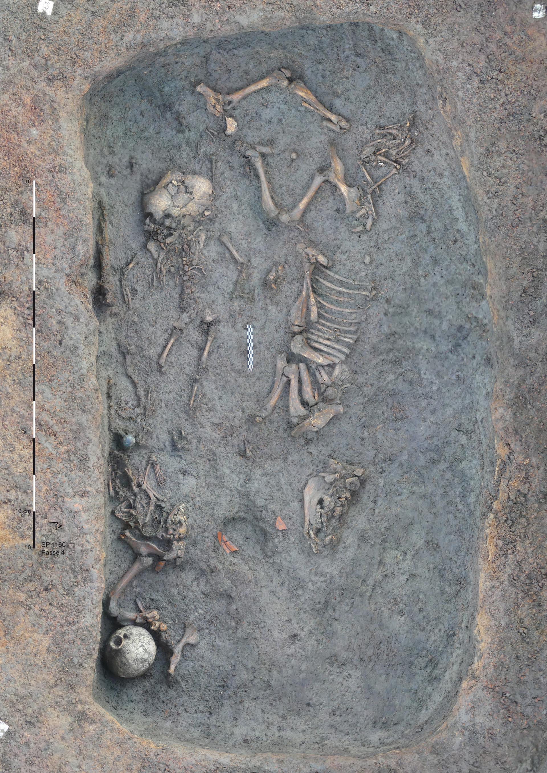 The excavation revealed an exceptional burial on the fringes of a Gallo-Roman settlement. This tomb houses a child who died around the age of one during the Augusto-Tibetan era, that is to say in the three decades following the birth of Jesus Christ. He was buried in a fitted coffin measuring 80 cm, the wood of which is not preserved but is materialized by numerous nails and an ornamental iron plate. This small coffin was placed in a larger pit (2 meters long by 1 meter wide) which provides the space necessary for a remarkable quantity of objects.