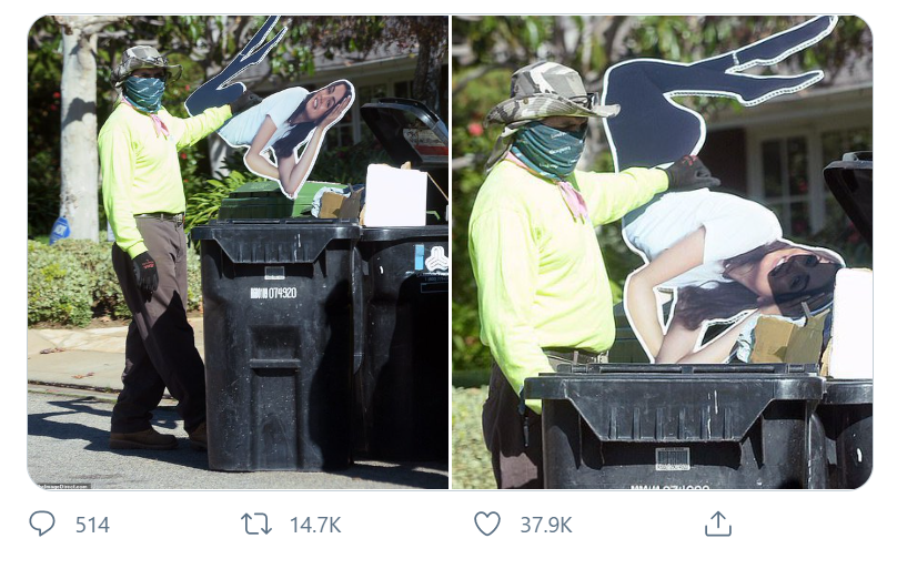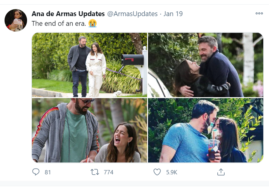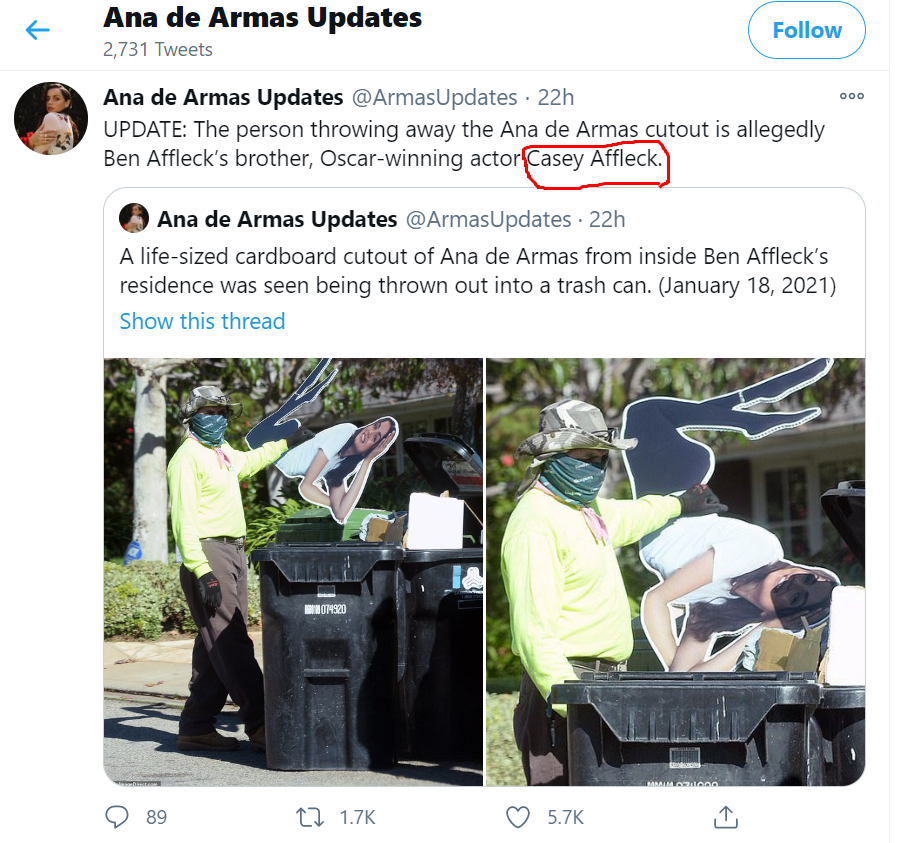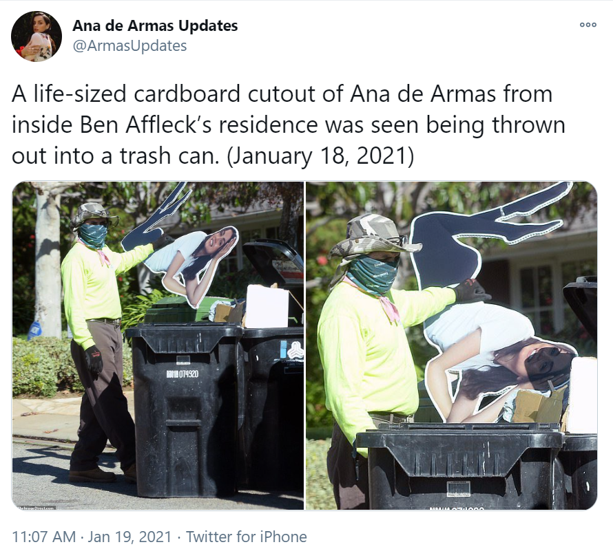 이야기인즉슨 LA에 있는 애플렉 집구석 가비지캔에 저 컷아웃이 버려지는 것이 목도되었다고 하는데, 뭐 빤하지 않겠는가? 관계가 파탄났으니 저런 일이 있을 법하고, 실제도 그런 모양이라, 심심해서 Ana de Armas 라는 여식 트위터 계정을 찾아 들어갔더니 업데이트한 소식이 올라오는지라