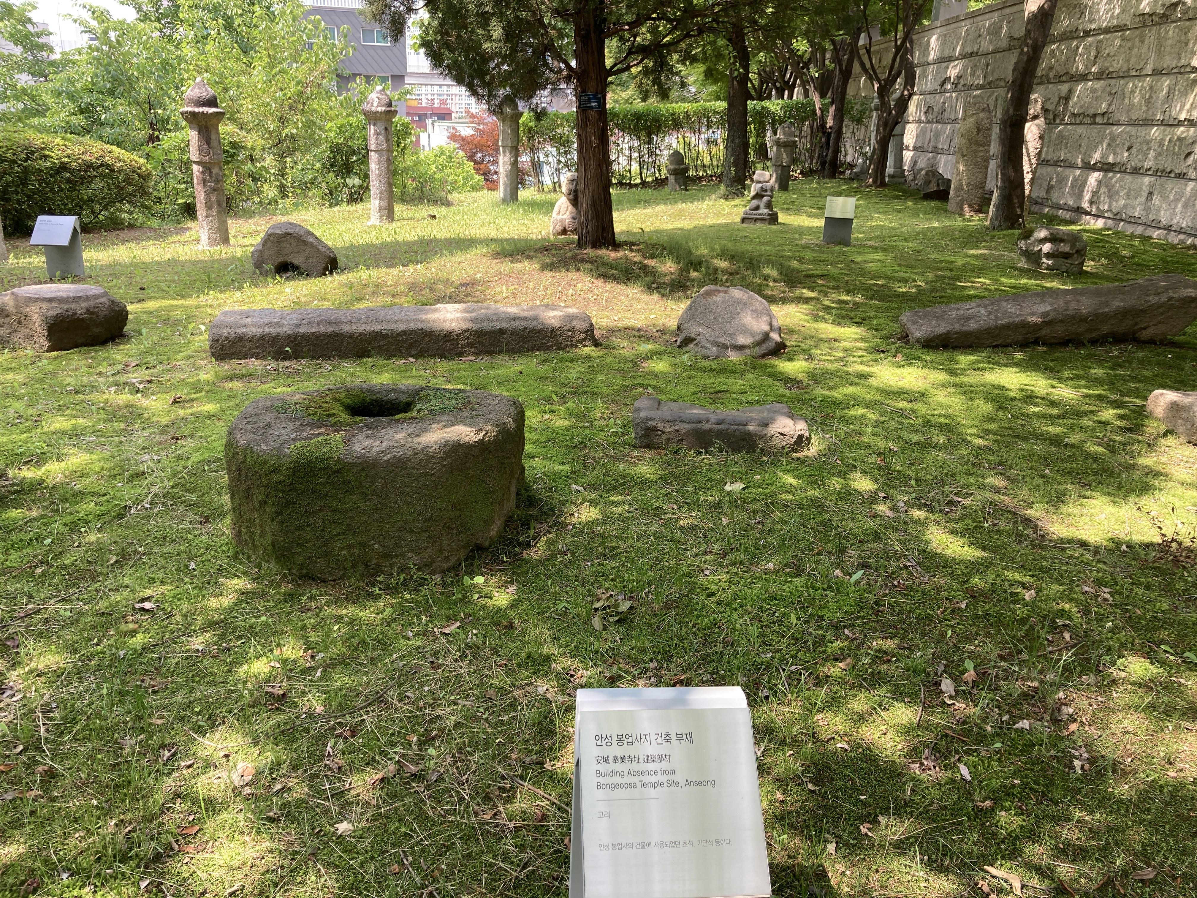 주차장에서 내리면 문인석 등 조선시대 분묘 석조물이 야외전시장에 전시되어 있는데, 그 사이에 봉업사지 건축부재들이 눈에 띄었다. 평소에 눈여겨 보지 않았는데, 아마도 장대석, 초석 등이 봉업사지 석조부재인 것으로 보인다.