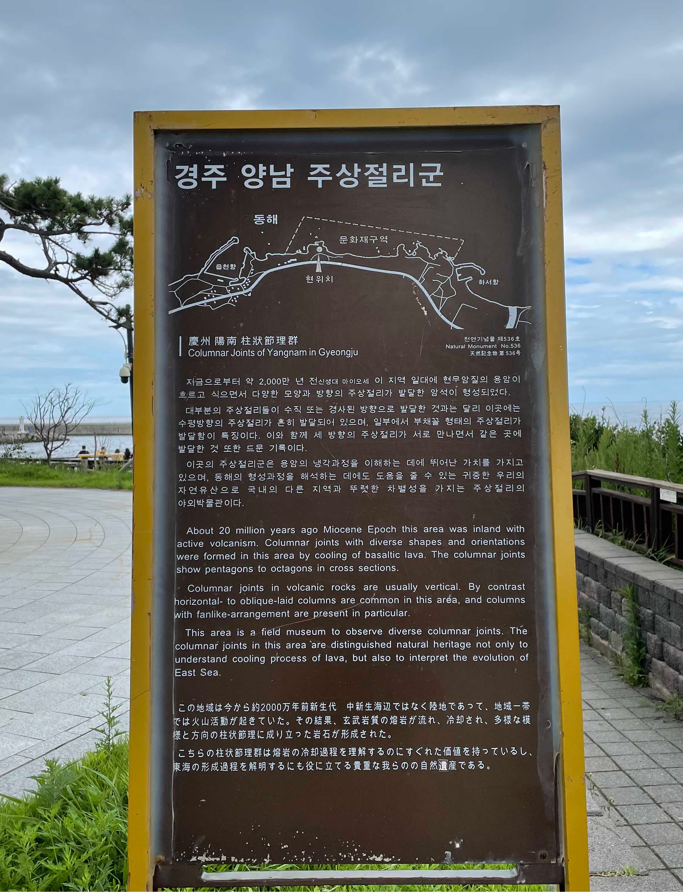 경주시 홈페이지 설명에 의하면 양남주상절리군을 이루는 현무암은 한반도와 붙어있던 일본이 잡아당기는 힘으로 떨어져 나가면서 동해가 형성되었을 때 만들어졌다고 합니다! 와우?!
