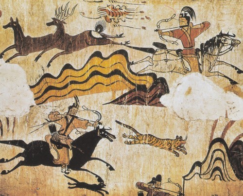 이렇게 말을 타며 동물을 사냥하는 그림을 ‘수렵도(狩獵圖)’, 혹은 ‘호렵도(胡獵圖)’ 라고 부릅니다.