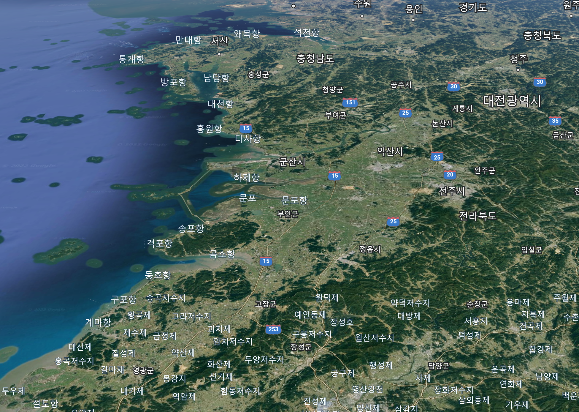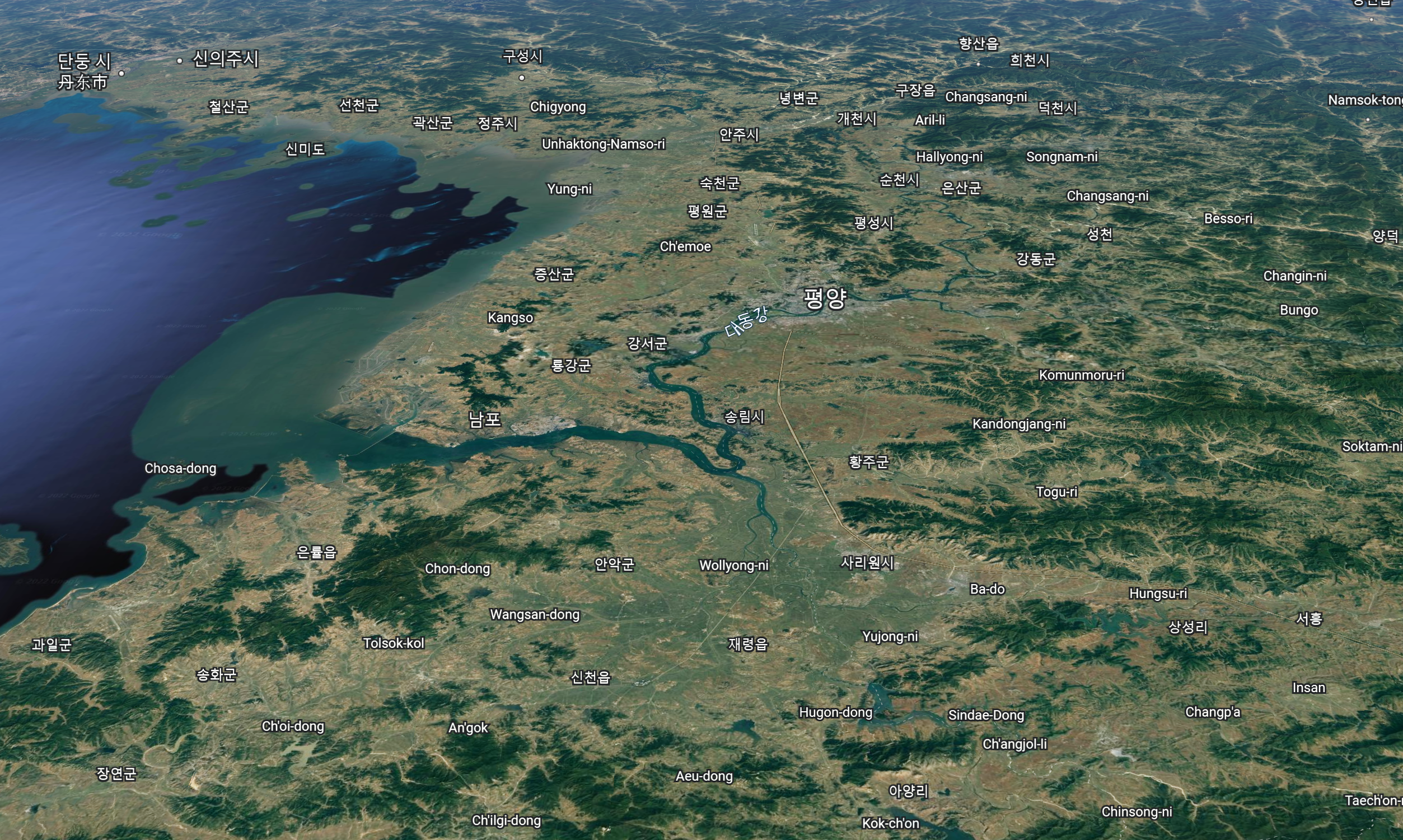 아래는 한반도 남부에서 대평원이 있는 지역으로 자주 거론되는 충남-전북 일대의 지역과 평양일대의 지형이다. 사진은 두 장 모두 구글 어스에서 따왔다.