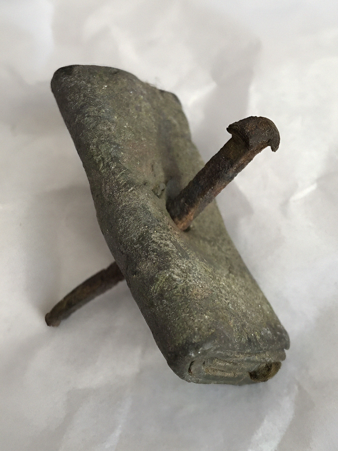 납 lead 으로 만든 이 저주판 30개는 여러 형태를 보여주었는데, 일부는 저 앞 사진처럼 못을 뚫어 박았고 또 어떤 것들은 간 liver 이나 미니어처 관 coffin 윤곽과 유사했다. 간을 씹어 먹으라 던져줬나 보다.