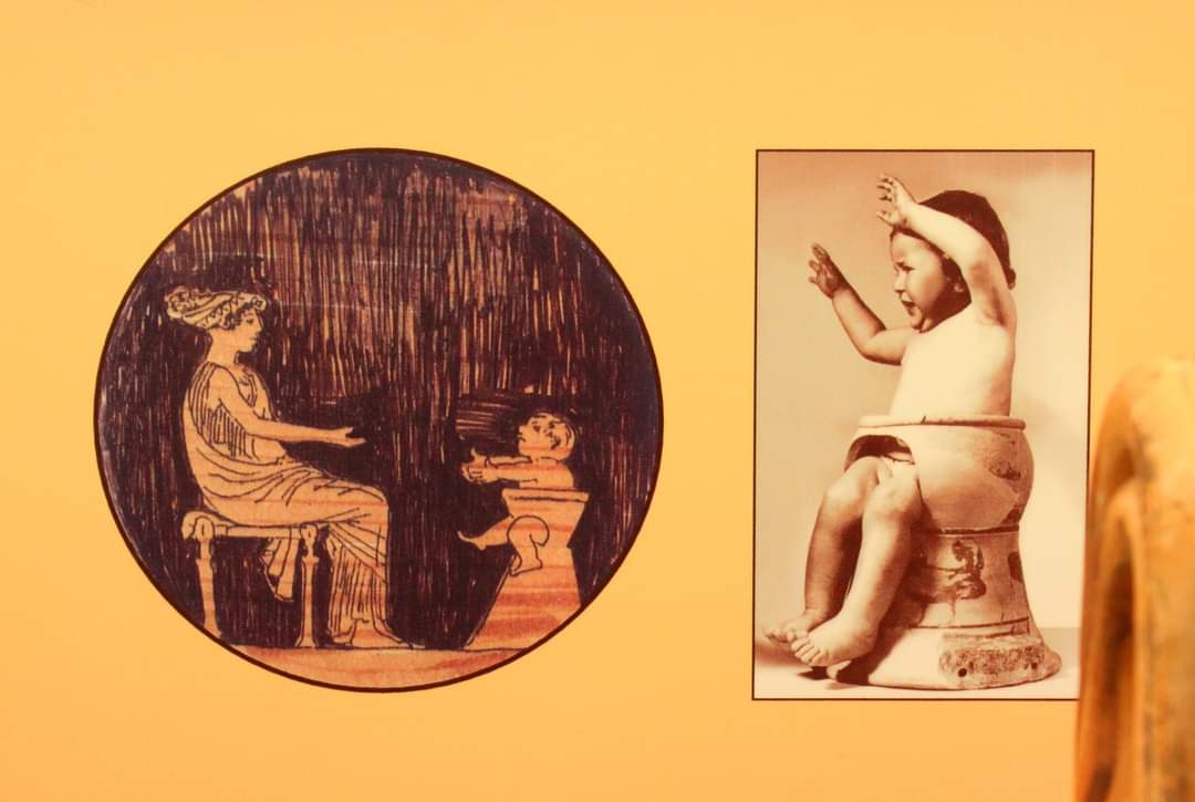 An ancient Greek kylix showing a baby sitting in his pottychair and calling to his mother. ca. 480 BCE, the Royal Museums of Art and History, Brussels. And a 6th Century BCE potty found in the Athenian Agora. Agora Museum, Athens