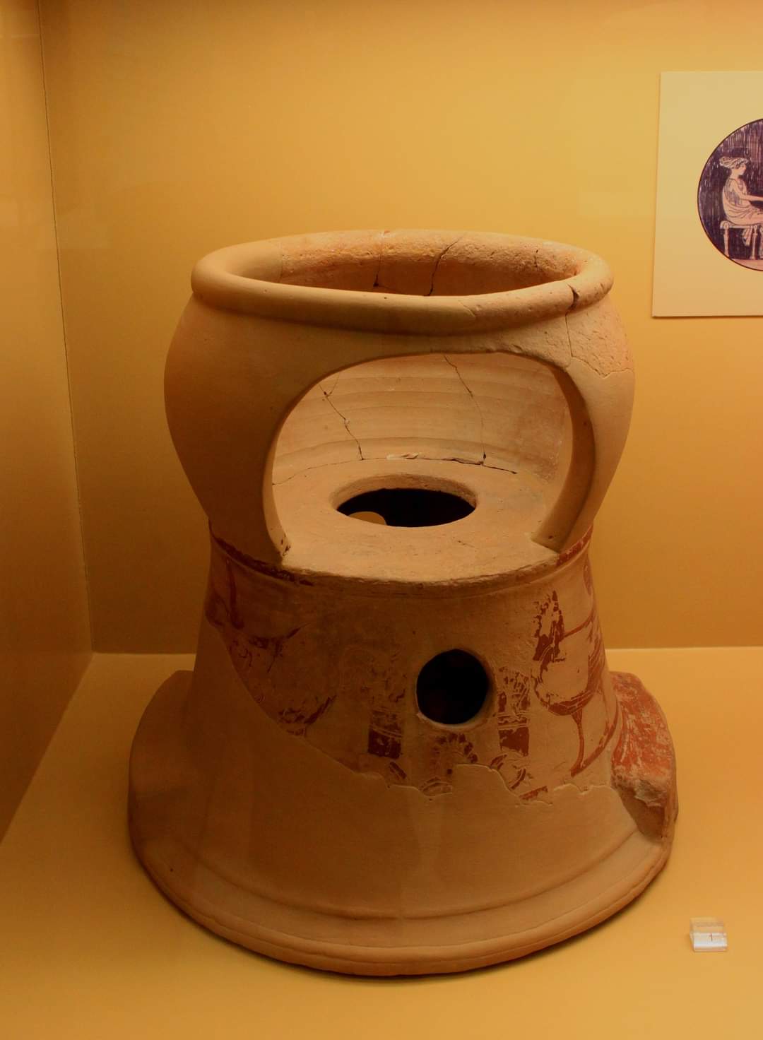 An ancient Greek kylix showing a baby sitting in his pottychair and calling to his mother. ca. 480 BCE, the Royal Museums of Art and History, Brussels. And a 6th Century BCE potty found in the Athenian Agora. Agora Museum, Athens