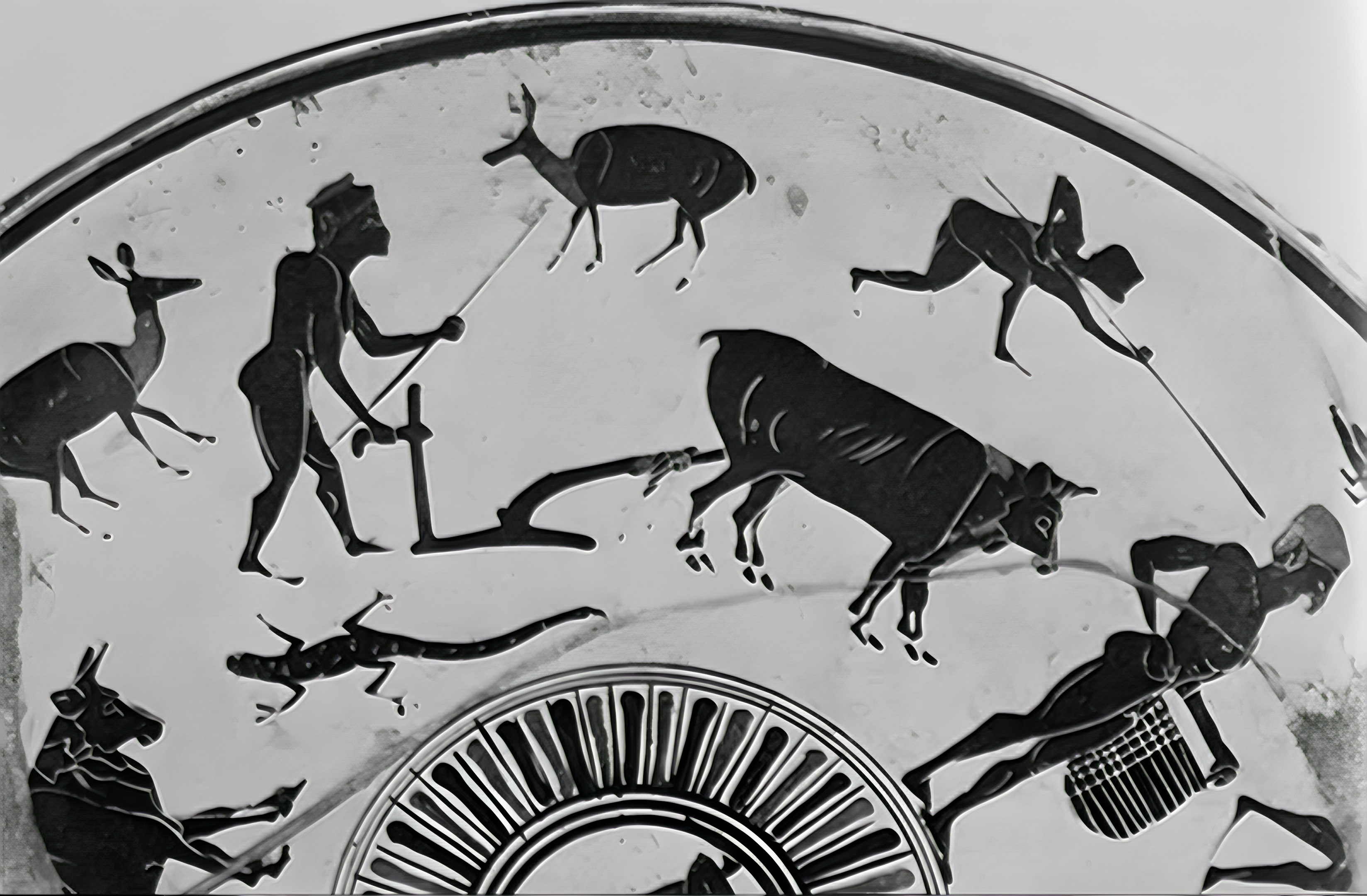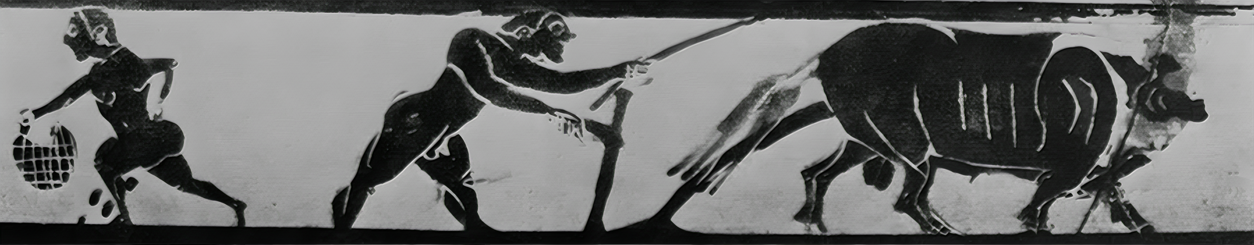 바로 앞은 아마 니코스테네스Nikosthenes 화가가 그리고 제작했을 아티카 검은색 인물화 컵 내부에 보이는 한 장면이라는데, 독일 베를린 슈타틀리치 뮤젠Berlin Staatliche Museen 소장품이라 한다. [Interior of Attic black-figure cup by the Nikosthenes Painter. Berlin Staatliche Museen. From W. Richter, Die Landwirtschaft im homerischen Zeitalter, Gottingen, 1968 (Archaeologia Homerica, H), pl. IIb.]