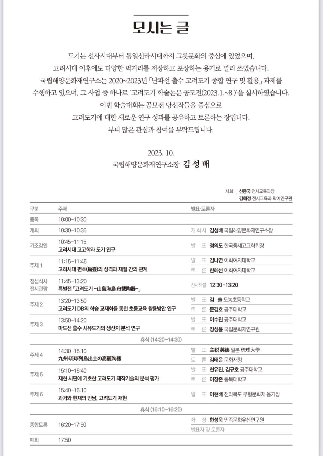 국립해양문화재연구소는 2020~2023년 r난파선 출수 고려도기 종합 연구 및 활용_ 과제를 수행하고 있으며, 그 사업 중 하나로 '고려도기 학술논문 공모전(2023.1.~8.)'을 실시하였습니다.