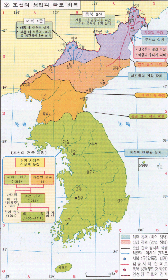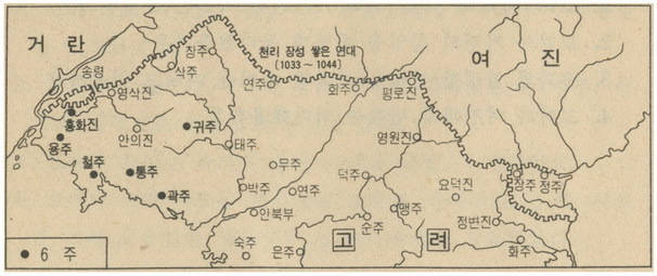 아래 그림에서 "고려초기의 국경"과 "통일신라의 국경"은 상당한 차이를 보이는데 이 지역이 고려전기에 새로 추가된 영역으로 고려초기의 국경은 천리장성이 완공된 1044년에 해당한다.