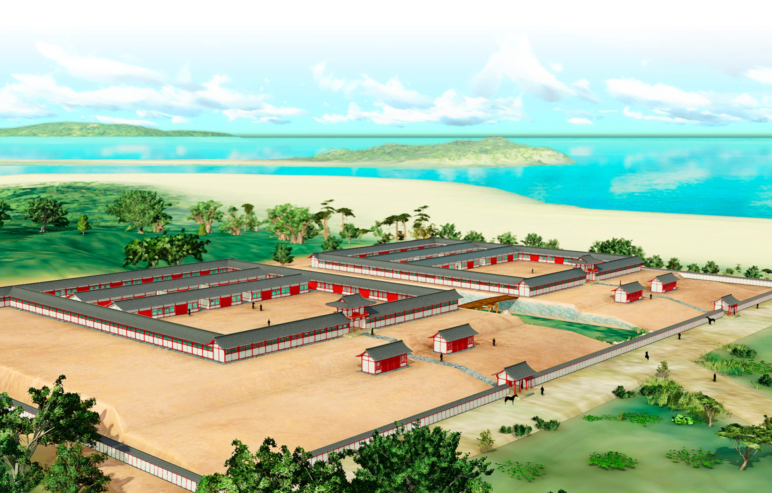 따라서 이 후쿠오카 홍려관은 1047년 대화제로 역사에서 종적을 감추기 전까지 대략 400년 간 일본이 외부 세계와 접촉하는 유일한 공식 창구이자 유일한 무역항으로 기능했다. 고대 일본이 세계와 접촉한 유일한 공식 창구가 홍려관이었던 것이다.