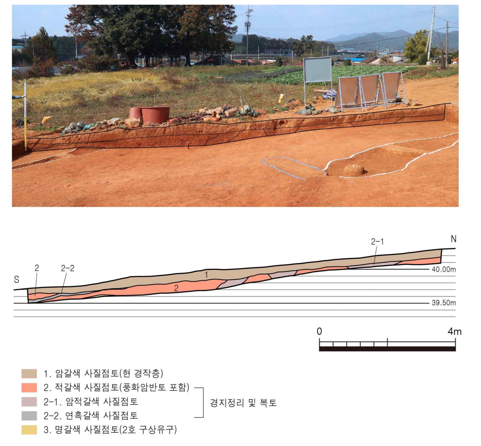 층위 양상 또한 구릉 상단부 지역은 대부분 표토층 하부로 풍화암반층이 노출된 양상을 보이며, 구릉 하단부지역은 표토층과 풍화암반층 사이로 과거 경작층과 일부 교란층이 확인된다.
