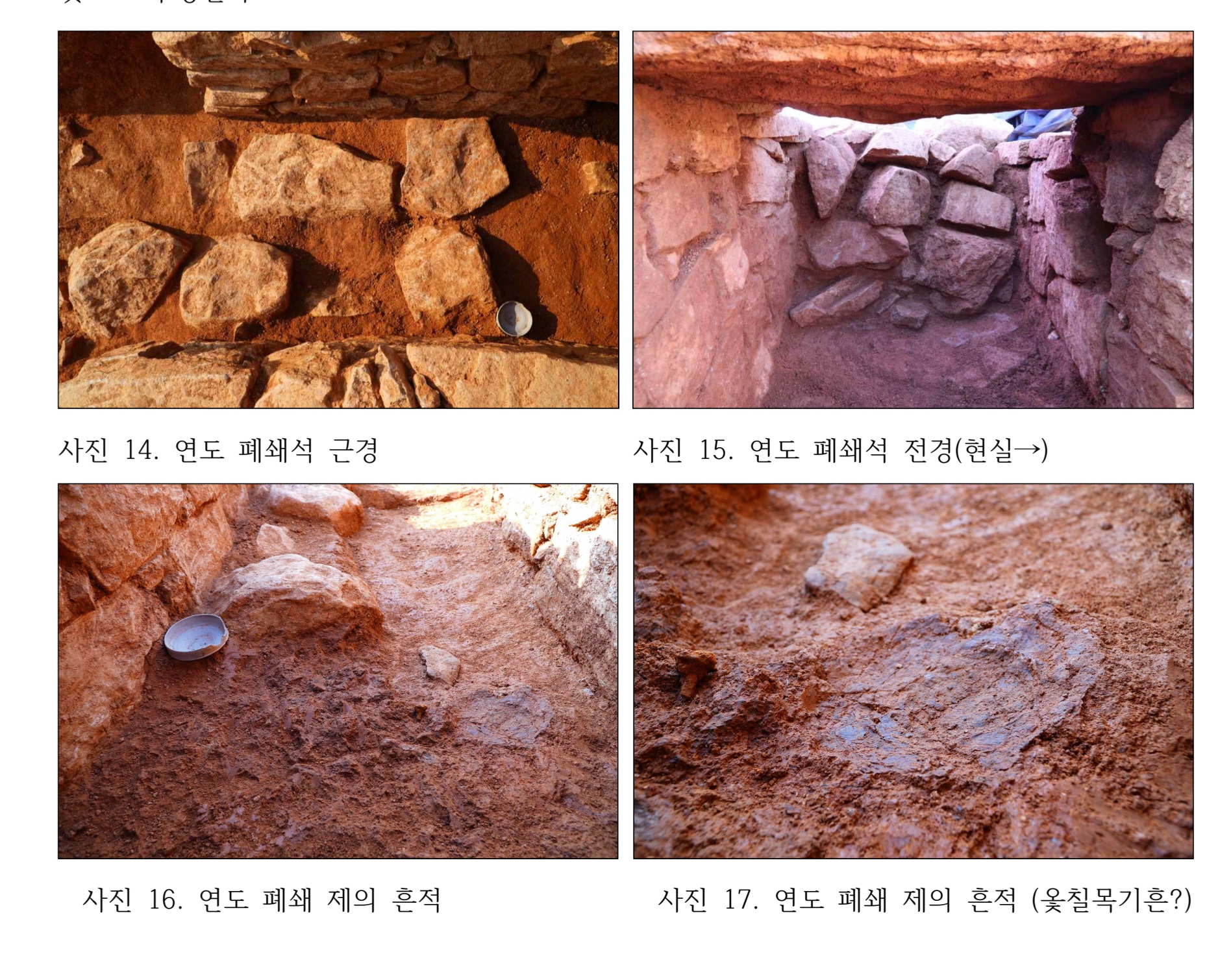 또한, 주변으로 형태를 알 수 없는 유기물흔이 분포하는 양상으로 보아 시신을 매납하고 현실 입구를 폐쇄하는 전 제의행위가 일부 이루어진 것으로 추정된다.