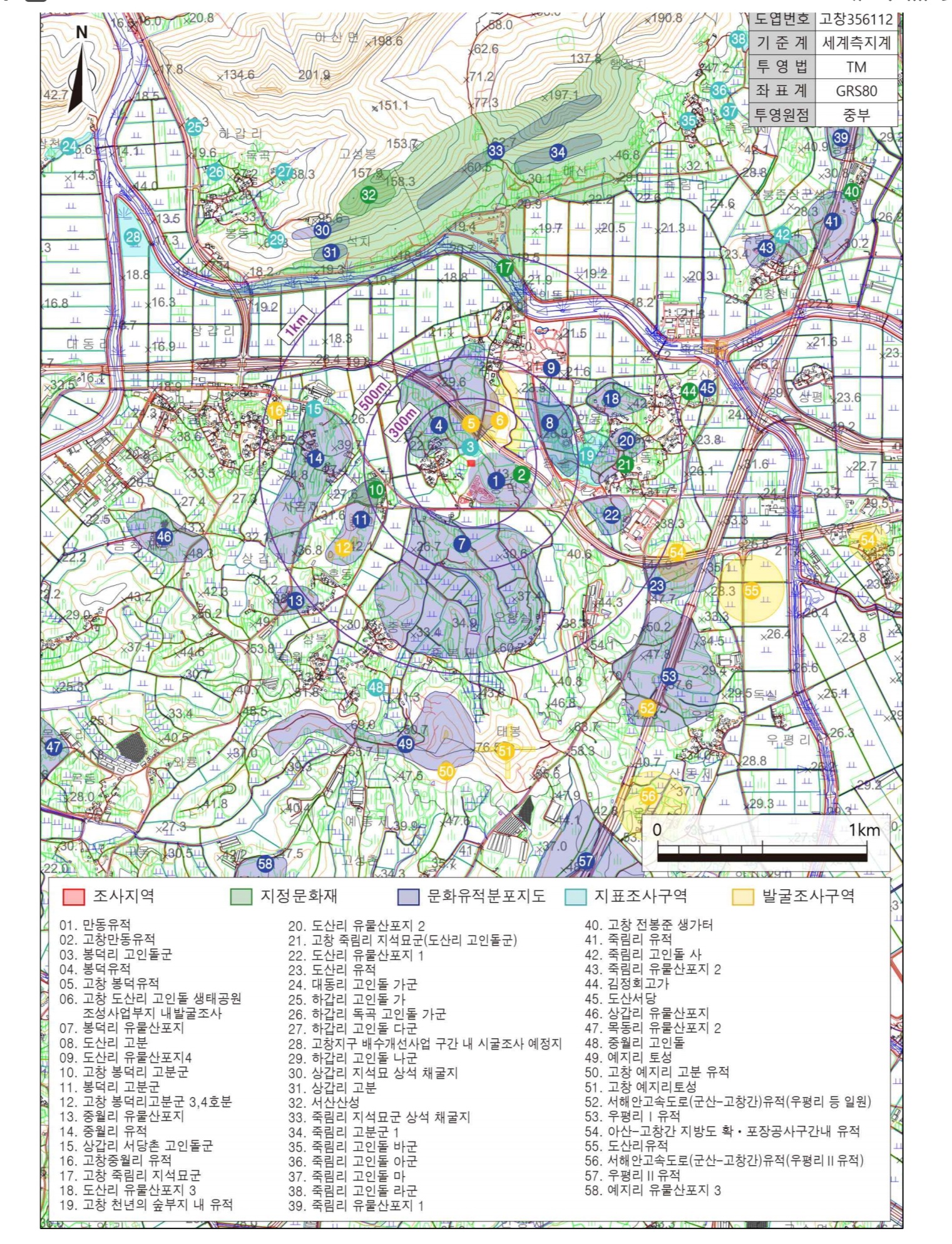 조사지역의 주변은 유적의 밀집도가 매우 높다. 기존에 알려진 ‘고창 죽림리 지석묘군’과 ‘고창 봉덕리 고분군’ 외에도 ‘봉덕유적’, ‘고창 만동유적’, ‘도산리 고분’, ‘봉덕리 고인돌군’ 등의 분묘 유적들이 인근에 자리를 잡고 있다.