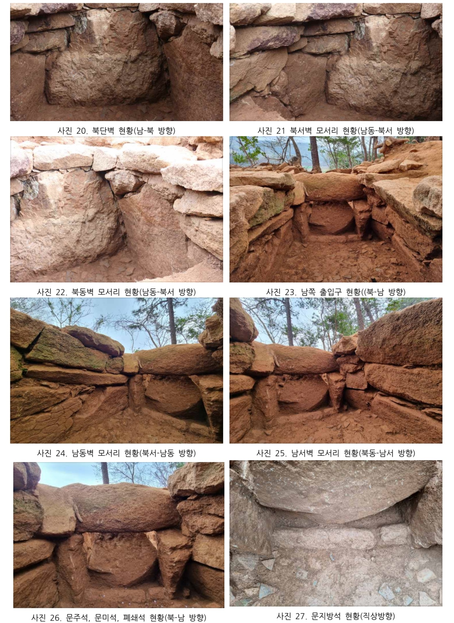 남쪽 출입구는 문주석을 세운 후 문지방석과 반타원형 모양 장대석을 시용하여 문미석을 세움.