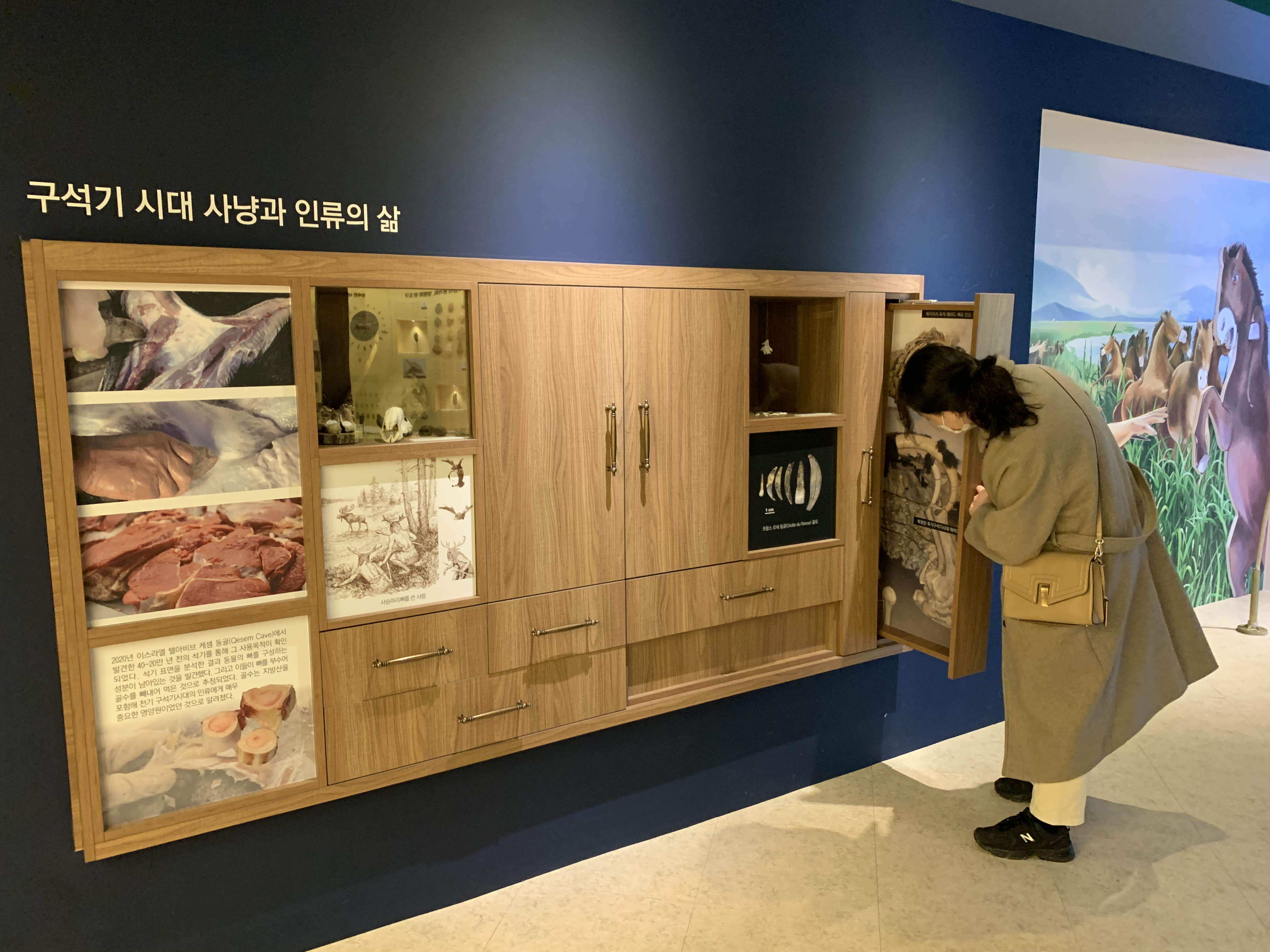 특별전시 <사냥혁명>에서도 이 서랍 전시기법을 활용했더라고요. 여기도 위에서 언급한 부분이 있다면 더 좋았겠다 하는 생각이 들었습니다.