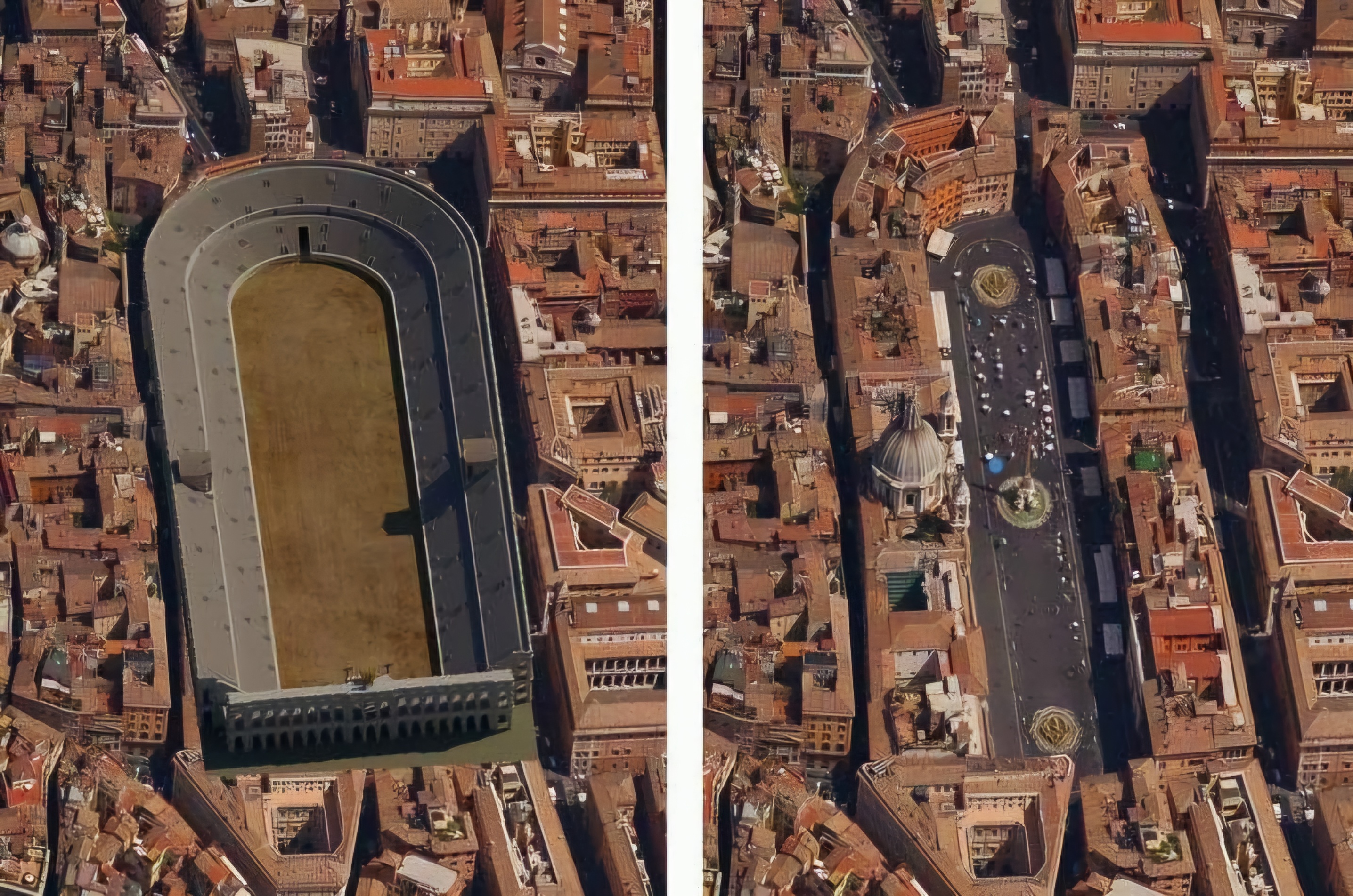 이를 보면 지금 남은 피아짜는 스타디움 운동장이고 관중석 테두리 시설을 따라 모조리 건물이 들어섰음을 본다.