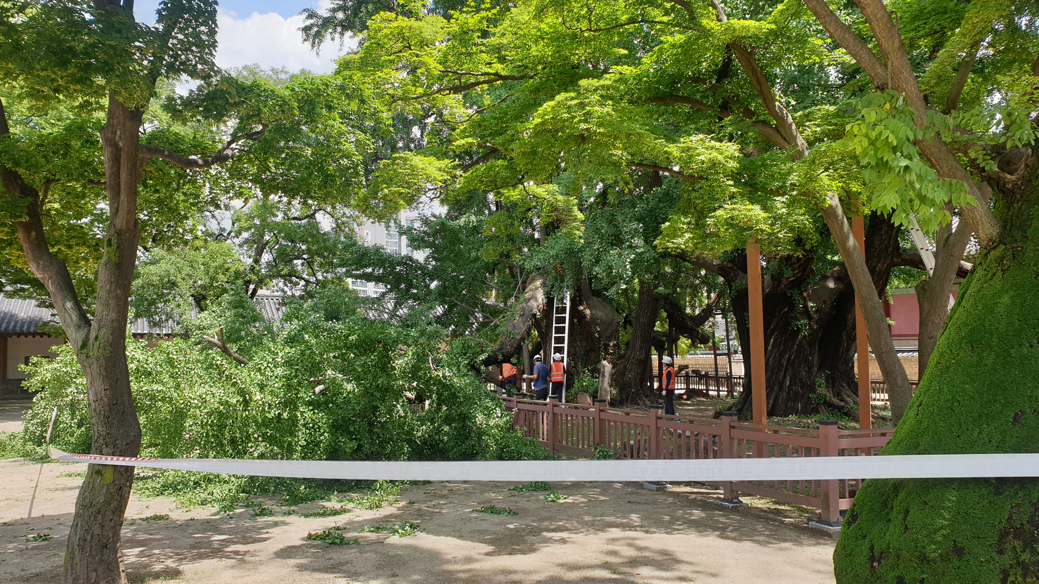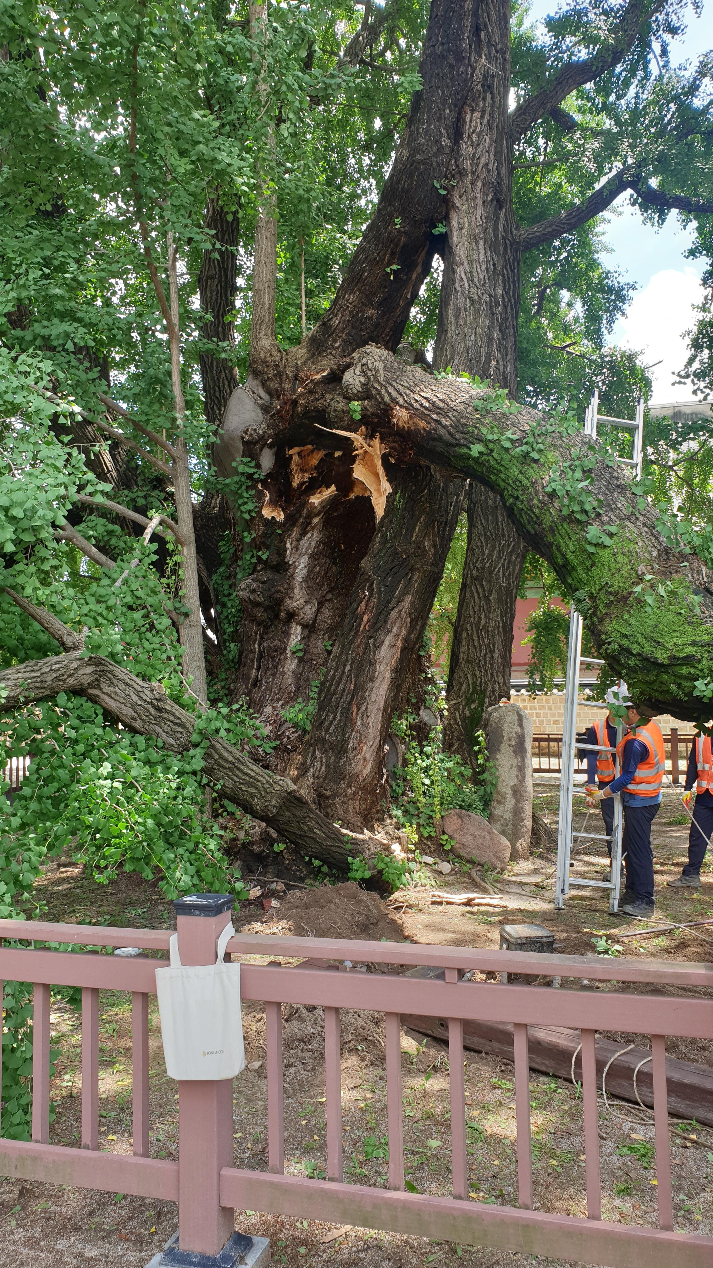 (서울=연합뉴스) 양정우 김예나 기자 = 수령이 400년 정도로 추정되는 서울 성균관 문묘(文廟)의 천연기념물 은행나무가 지지대 교체 작업 중 크게 파손됐다. 1일 종로구청과 성균관 등에 따르면