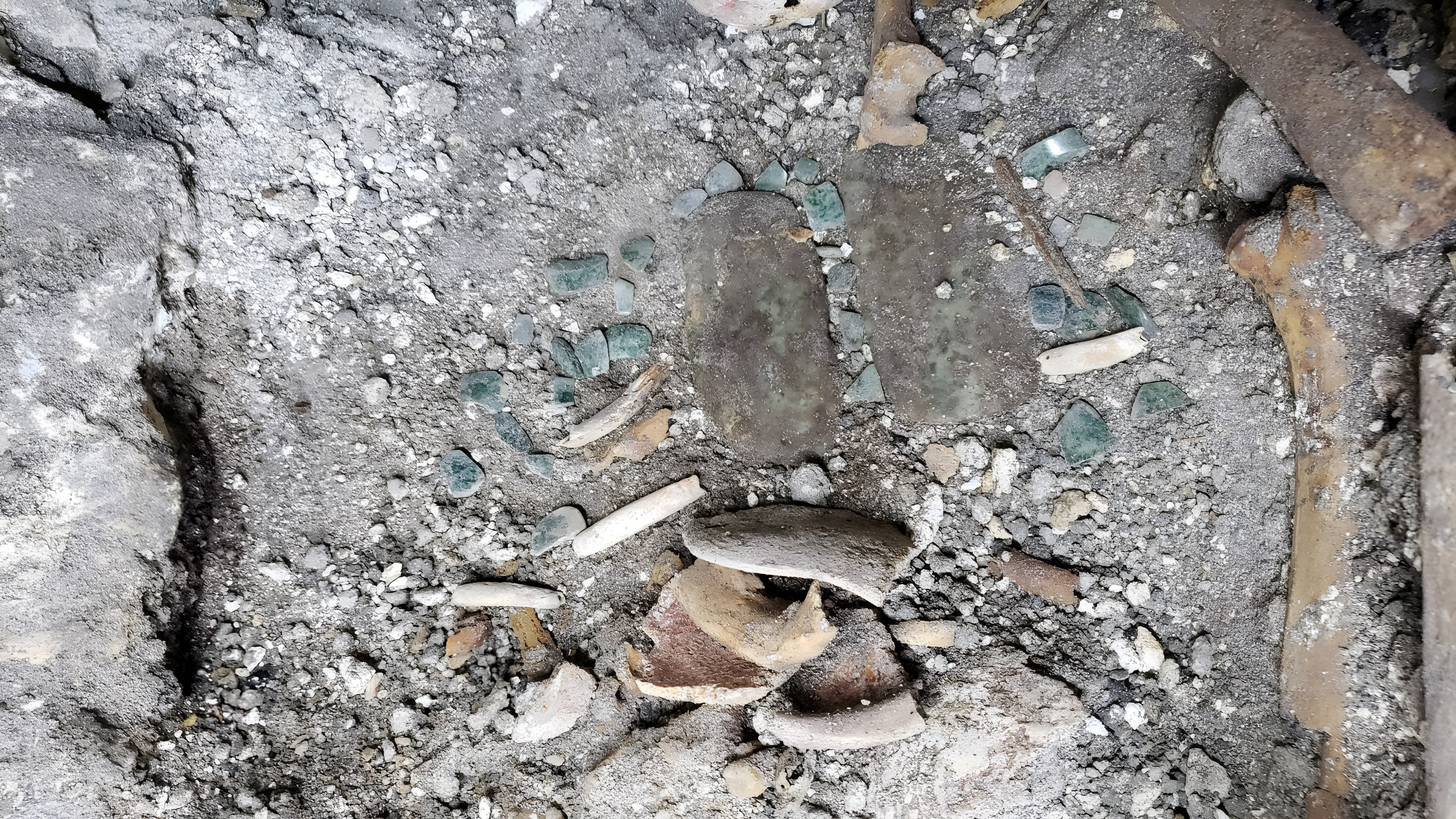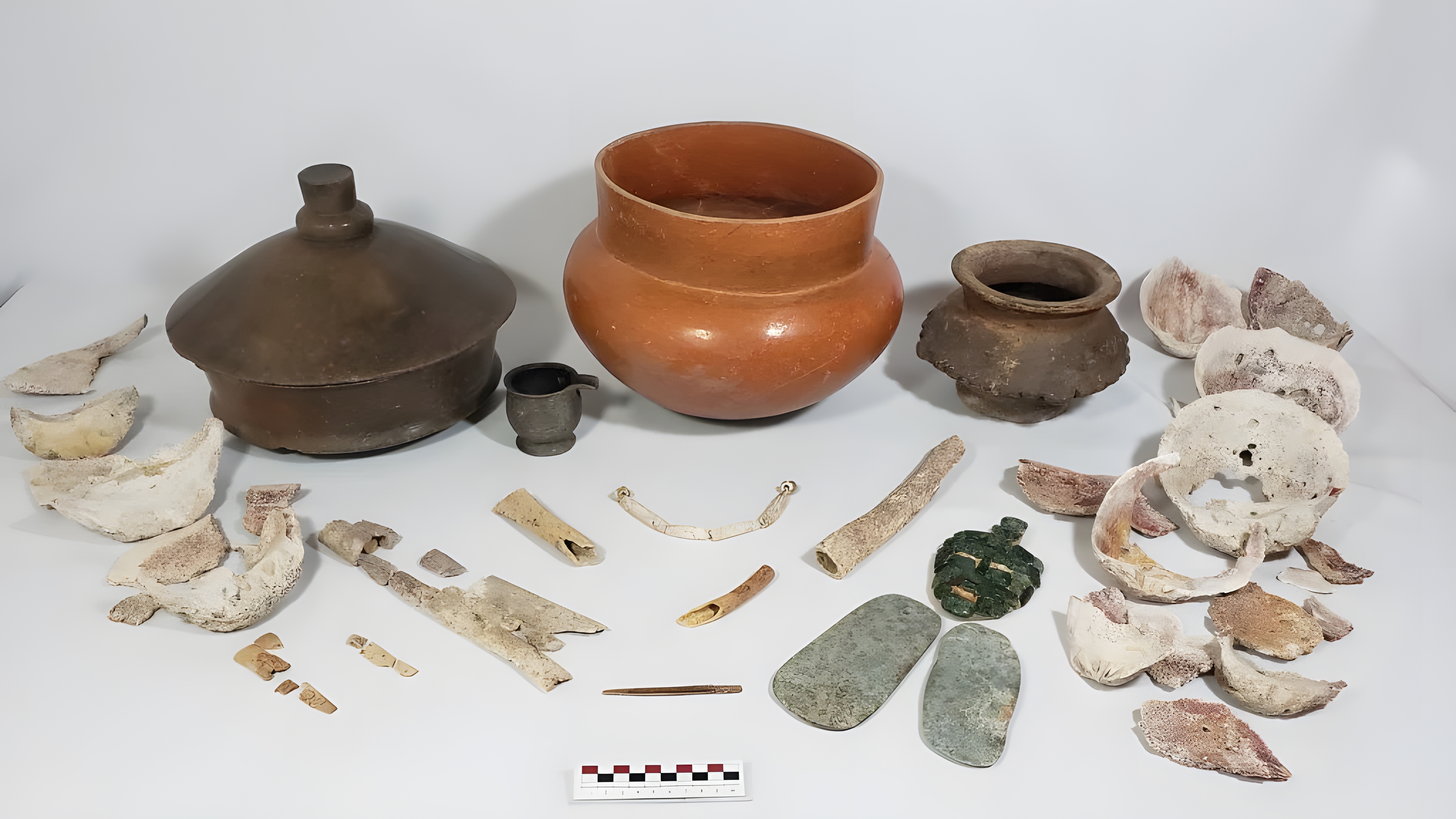무덤 안에서 툴레인 대학 Tulane University 팀은 모자이크 옥 마스크 mosaic jade mask, 문자를 새긴 인간 대퇴골 뼈 femur bones, 마야 왕족이 보석과 화폐로 사용한 이매패류 붉은 조개껍질 spondylus shells을 발견했다.