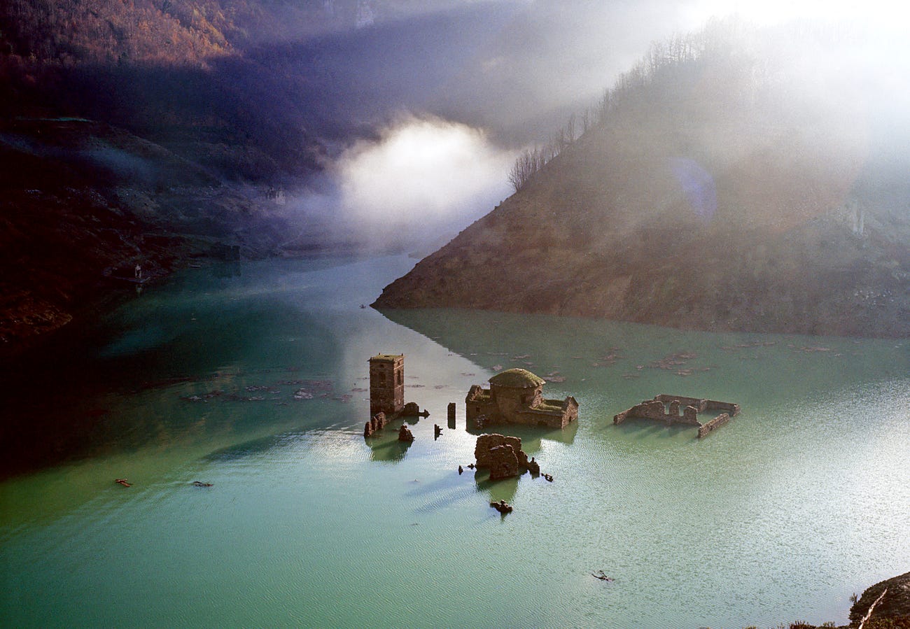 Fabbriche di Careggine in Tuscany was flooded by nearby Lake Vogli following the construction of a dam on the Edron river in 1947.