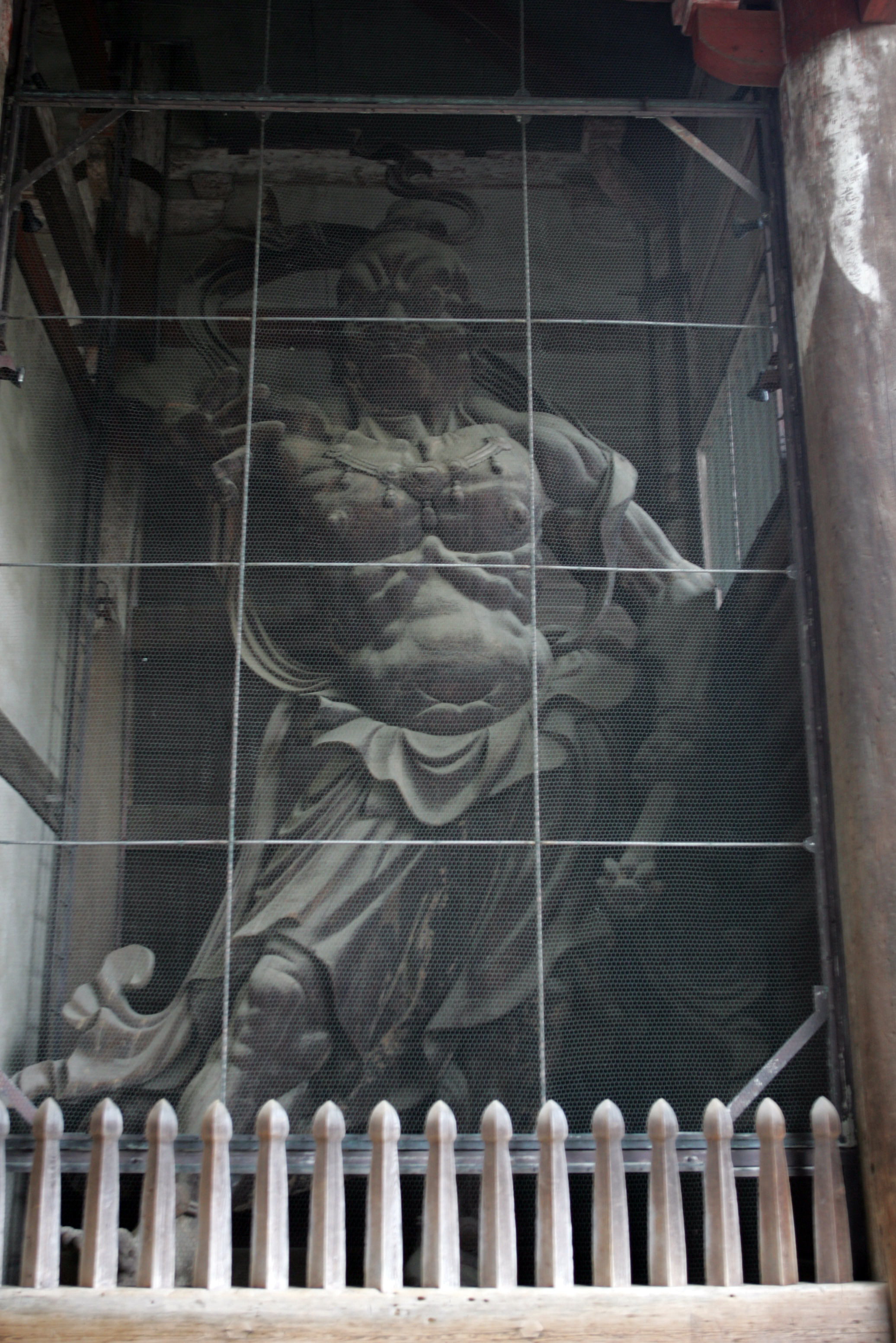 저 동대사 남대문 통로 안 양쪽에는 금강역사 한 쌍이 배치되어 있습니다. 이 분들을 꼭 자세히 보셔야 합니다. 다만 비둘기 똥을 방지한다며 철망으로 쳐놓았고, 또 나무 막대기를 쳐 놓아서 관람에는 여간 불편하지 않습니다.
