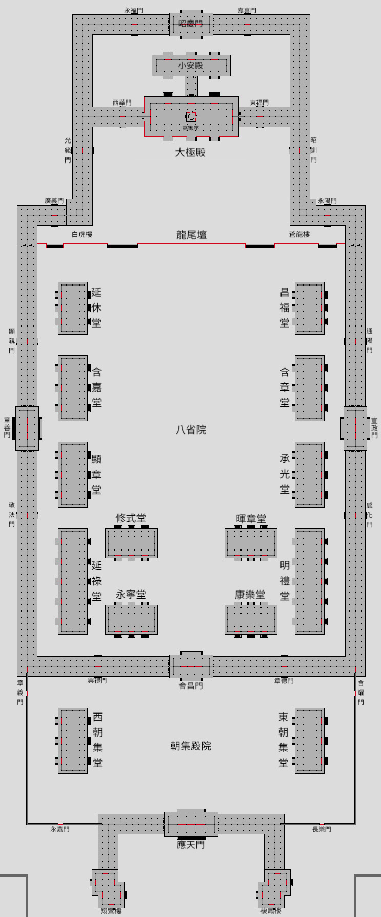 태정관太政官이라 표시된 곳은 조선으로 치면 의정부라고 보시면 됩니다. 저 중에서 태극전 구역만을 떼어서 보면 다음과 같습니다.