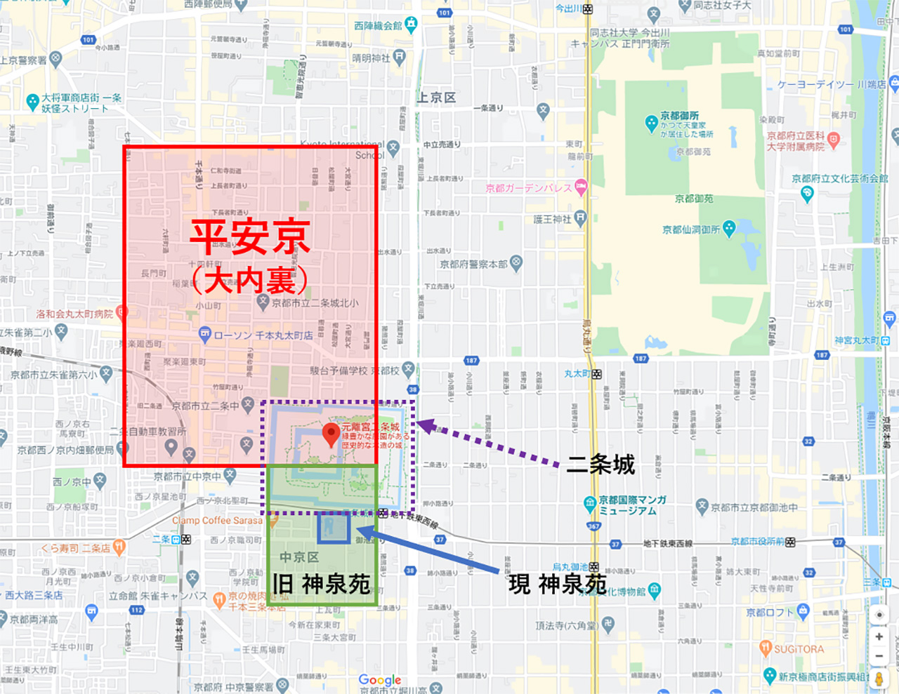 이조성이 그 옛날 평안경 시절 황궁 동남쪽 지점, 곧 이조대로二条大路가 지나는 지점임을 알 수 있습니다.