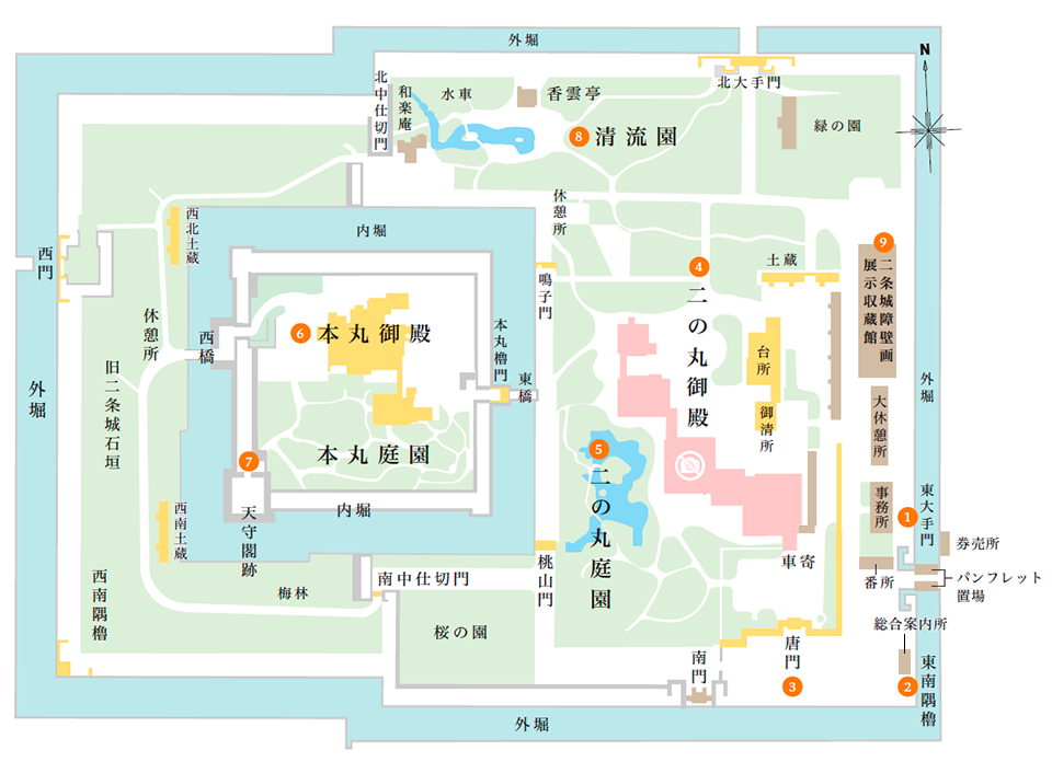 1.동대수문東大手門 2.번소番所 3.당문唐門 4.二の丸御殿車寄 5. 二の丸御殿遠侍·式臺·大広間 6. 二の丸御殿黒書院 7. 二の丸御殿白書院 8.二の丸庭園 9.蓬莱島 10.臺所 11.御清所 12.土蔵 13.便所 14.事務所 15.南門 16.桜の園 17.梅林 18.西門 19.本丸御殿 20.本丸櫓門 21.本丸庭園 22.天守臺 23.和楽庵 24.香雲亭 25.北大手門 26緑の園 27.展示·収蔵館