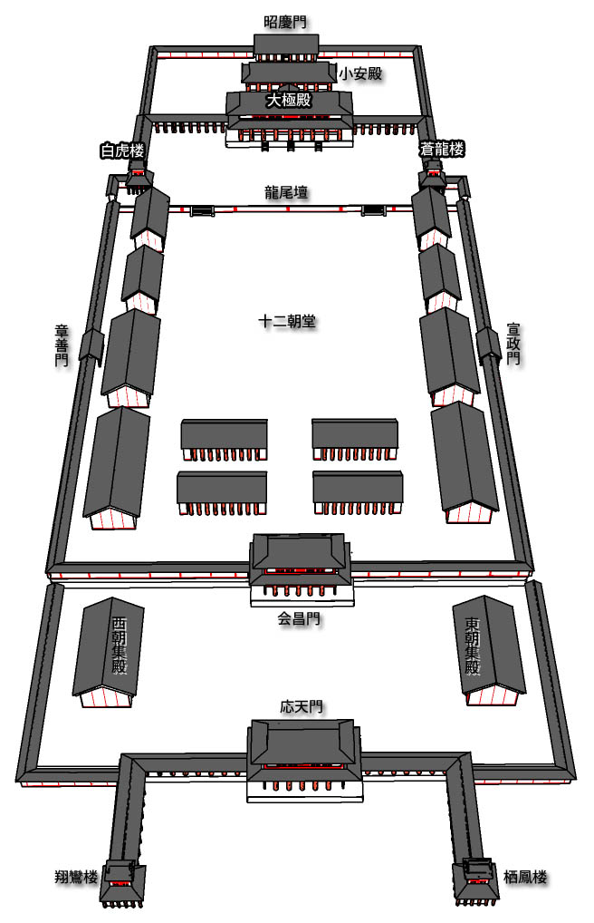 이것도 역시 정사각형에 가까운 방향으로 구획했으며, 동서남북 각 성벽마다 3개씩, 모두 9개 성문이 있음을 봅니다. 남쪽 정중앙 주작문朱雀門이라는 데가 남대문입니다. 경복궁으로 치면 광화문입니다. 그 주작문 앞으로 남쪽으로 큰 도로가 펼쳐지는데 이를 주작대로朱雀大路라 합니다.