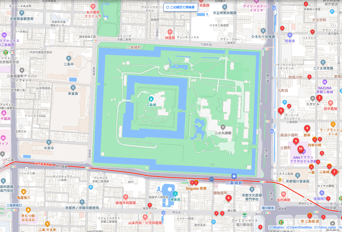 경도 체류 중 첫날 오전 들리게 될 곳이 이조성二条城과 경도어소京都御所인데, 앞에서 보신 것처럼 두 곳은 현재의 경도 시내 중앙을 차지하며, 서로 인접지점이며, 나아가 최고 권력자의 독점하는 공간이었습니다. 어소 남서쪽에 니조성이 있습니다.