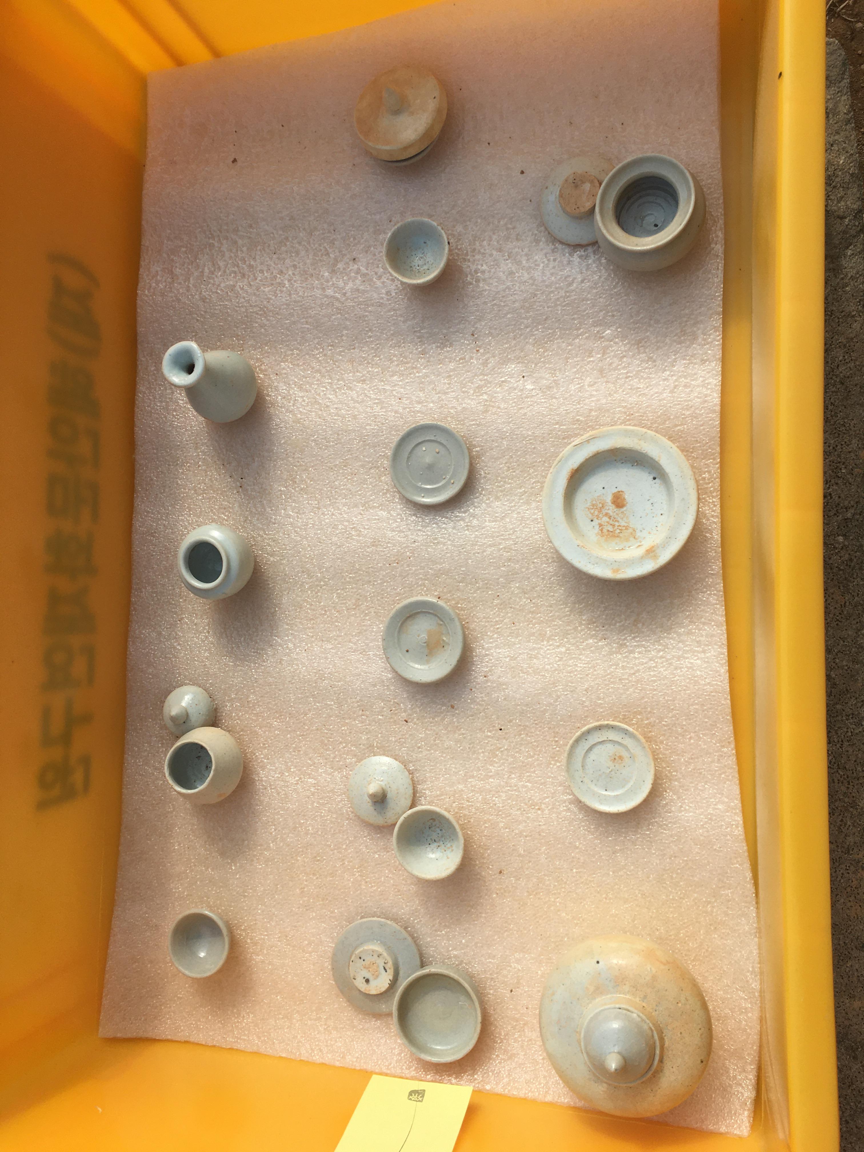 좌우의 감실에서 백자 명기가 각각 17점, 20점이 출토되었는데 여자측 명기가 유색이나 굽의 상태로 보아 좀 더 고급품이다. 조사단에서는 17세기 관요 생산품으로 추정했다.